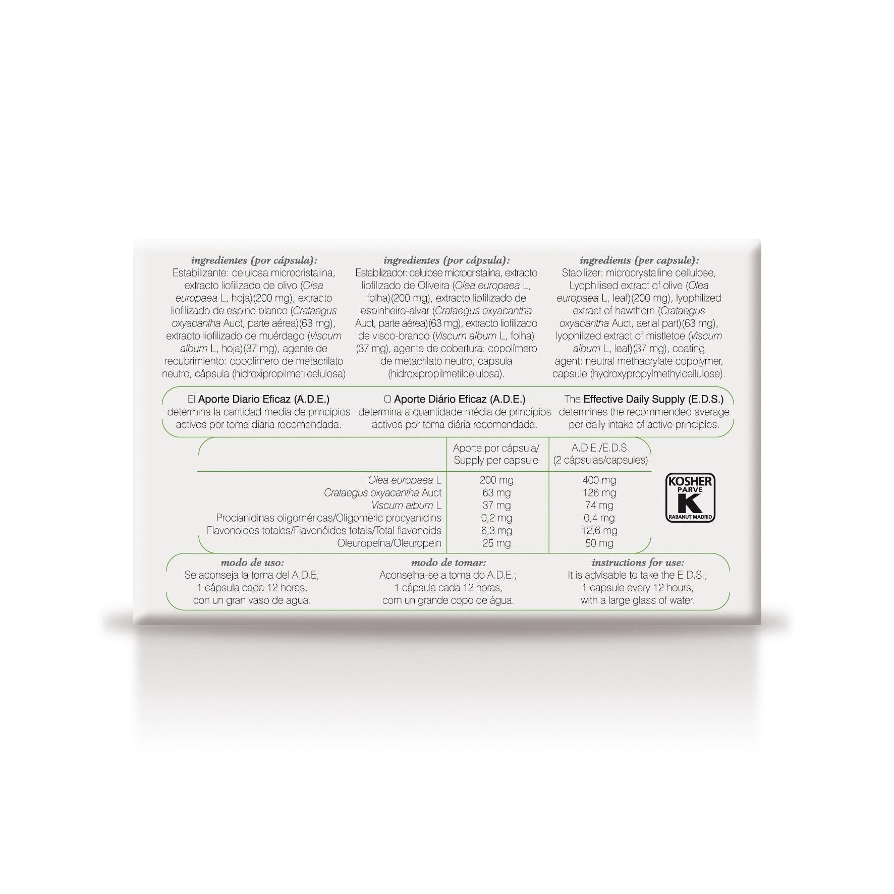 (por cápsula) Estabilizante: celulosa microcristalina, extracto liofilizado de olivo (Olea europaea L, hoja) (200 mg), extracto liofilizado de espino blanco (Crataegus oxyacantha Auct, parte aérea) (63 mg), extracto liofilizado de muérdago (Viscum album L, hoja) (37 mg), agente de recubrimiento: copolímero de metacrilato neutro, cápsula (hidroxipropilmetilcelulosa).