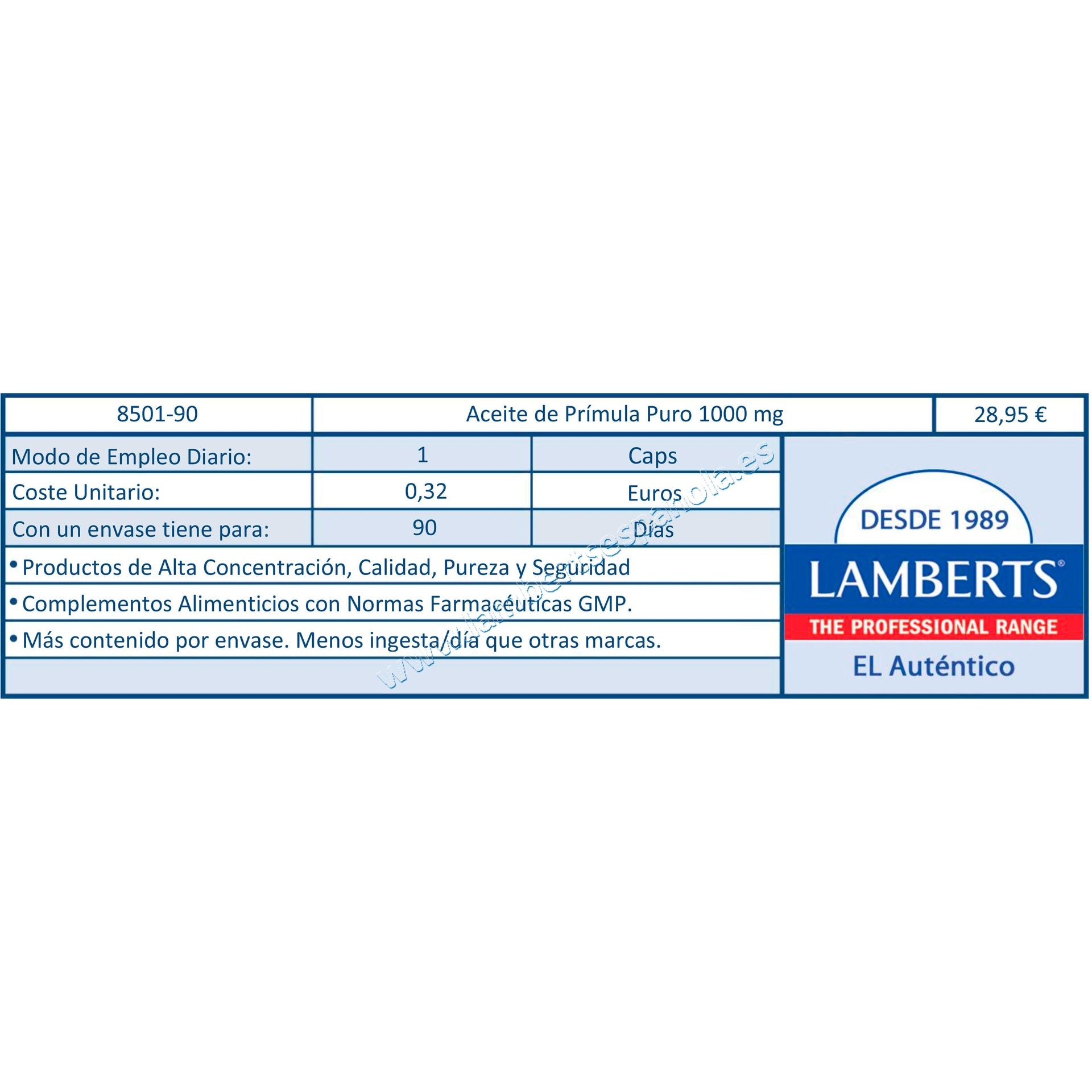 El Aceite de Prímula de Lamberts es un suplemento alimenticio en forma de cápsulas blandas, elaborado a partir de aceite de semillas de prímula (Oenothera biennis) de alta calidad. Este aceite es especialmente rico en ácido gamma-linolénico (GLA), un ácido graso esencial omega-6 que el cuerpo puede convertir en prostaglandinas, compuestos que participan en la regulación de diversas funciones biológicas. Se utiliza para aliviar los síntomas del síndrome premenstrual, mejorar la salud de la piel y apoyar el bienestar general.