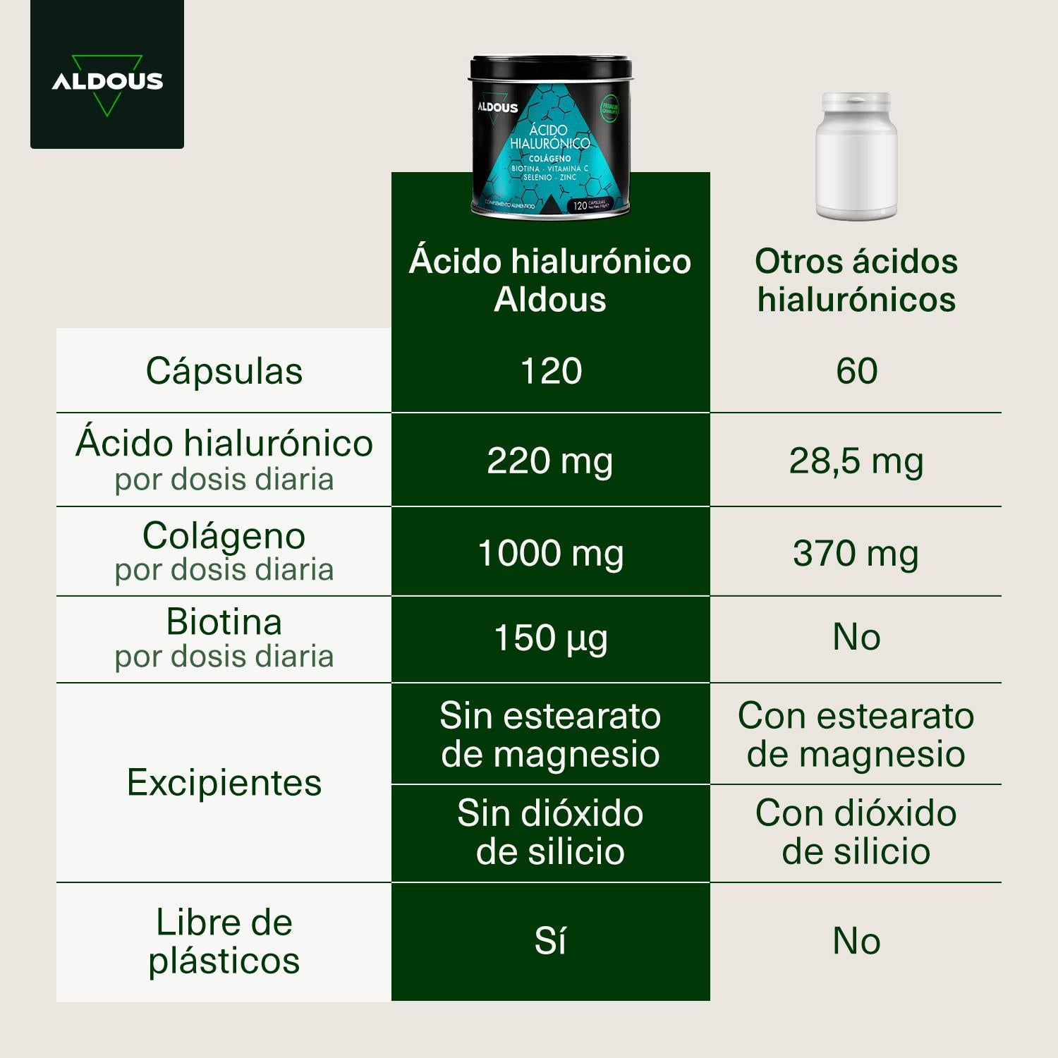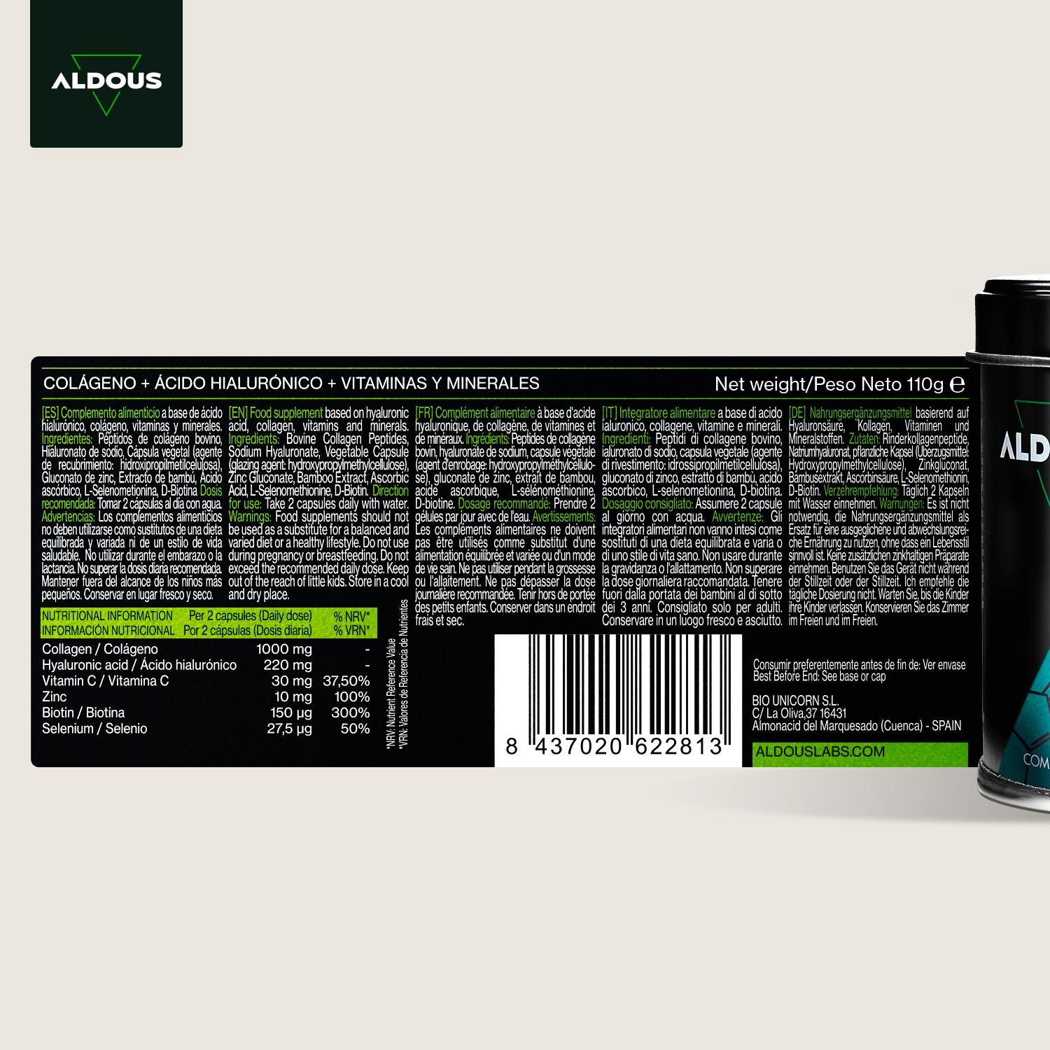 Toda la información sobre "Ácido hialurónico + Colágeno, Vitamina C, Biotina, Zinc, Selenio Aldous BIO 120 cápsulas XL"
