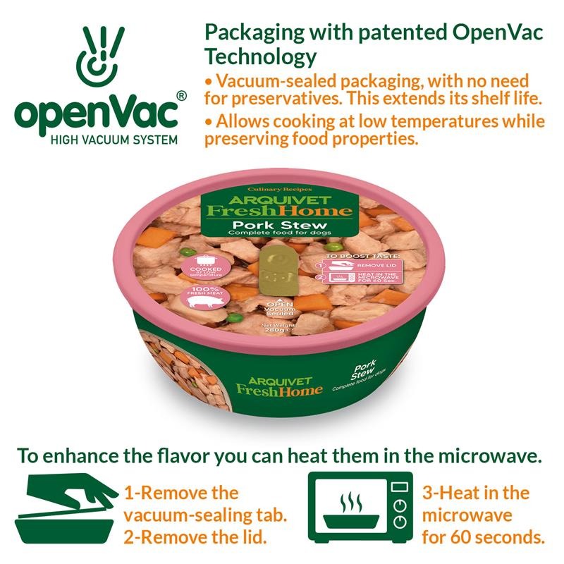 - Envase con Tecnología patentada OpenVac. Sellado al vacío sin necesidad de conservantes, prolongando así su vida útil. Permite cocinar a baja temperatura preservando las propiedades de los alimentos.