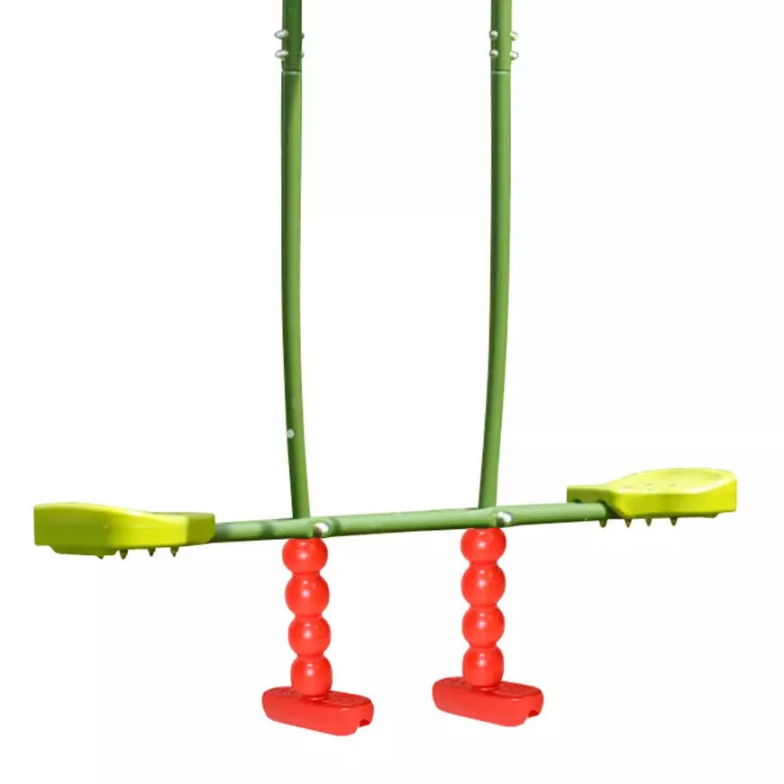 Los asientos y el reposapiés son de plástico para garantizar la comodidad de los niños. Cuenta con tubos de acero galvanizado que resistirán perfectamente ante las inclemencias del tiempo.