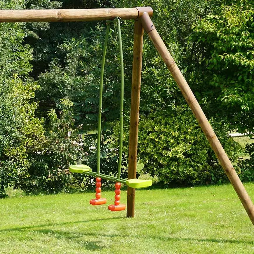 Este balancín se adapta a las estructuras SOULET con una altura de 2,22 m con una viga de 10 cm de diámetro. Puede dar cabida hasta a dos niños y soportar una carga máxima de 70 kg, es decir, 35 kg por asiento. Adecuado para niños de 3 a 12 años.