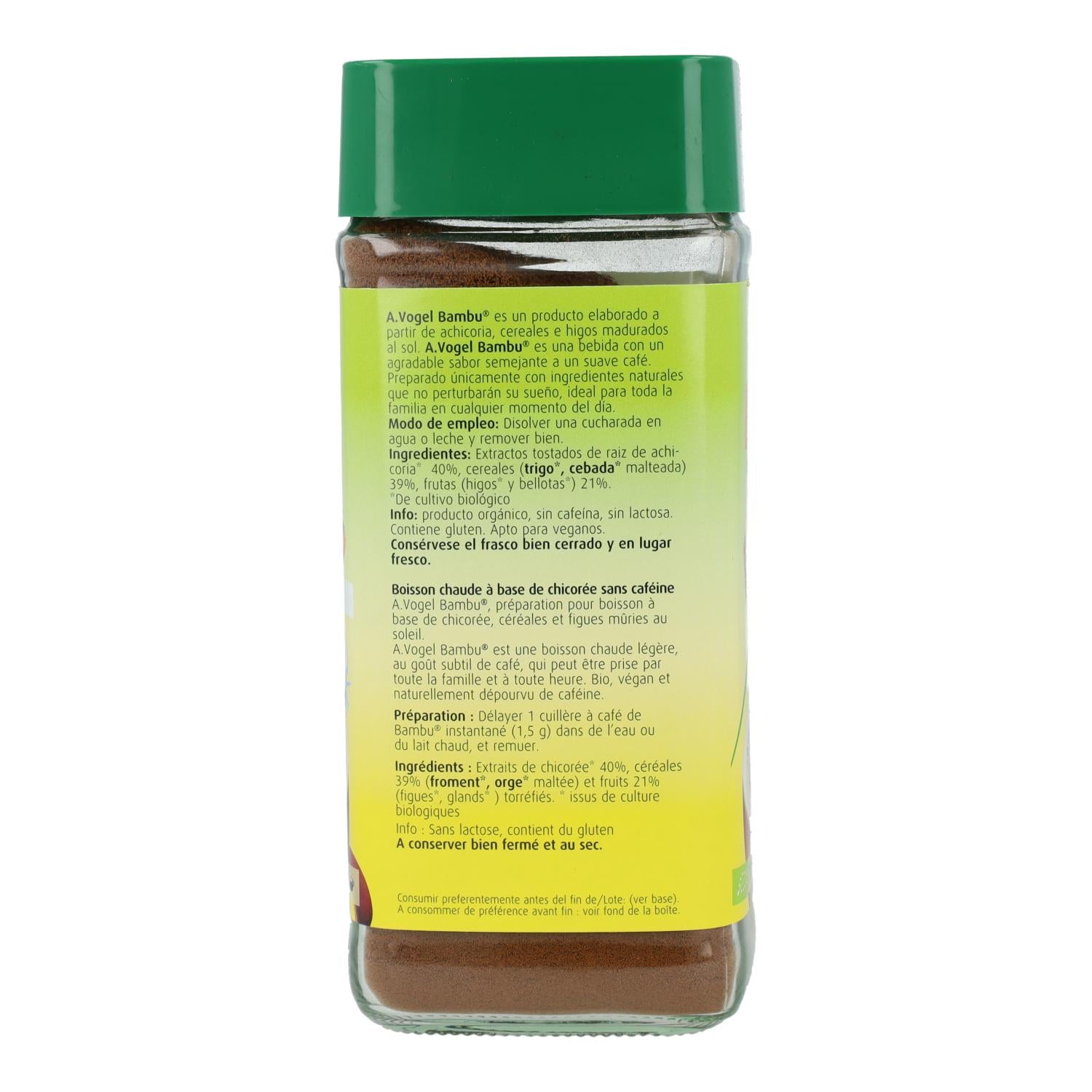 El Bambú instantáneo A.Vogel es una bebida soluble 100% natural a base de cereales, frutos y achicoria de cultivo biológico. Posée un aroma y sabor inigualable, similar a los mejores cafés tostados del mundo. No altera el sueño ya que no contiene cafeína. Puede ser tomado a cualquier hora, sólo o con leche y hará las delicias de un buen desayuno. También pueden tomarlo los niños. Es instantáneo y puede disolverse también en leche fría (de soja, avena, arroz). Ideal para una bebida de verano.