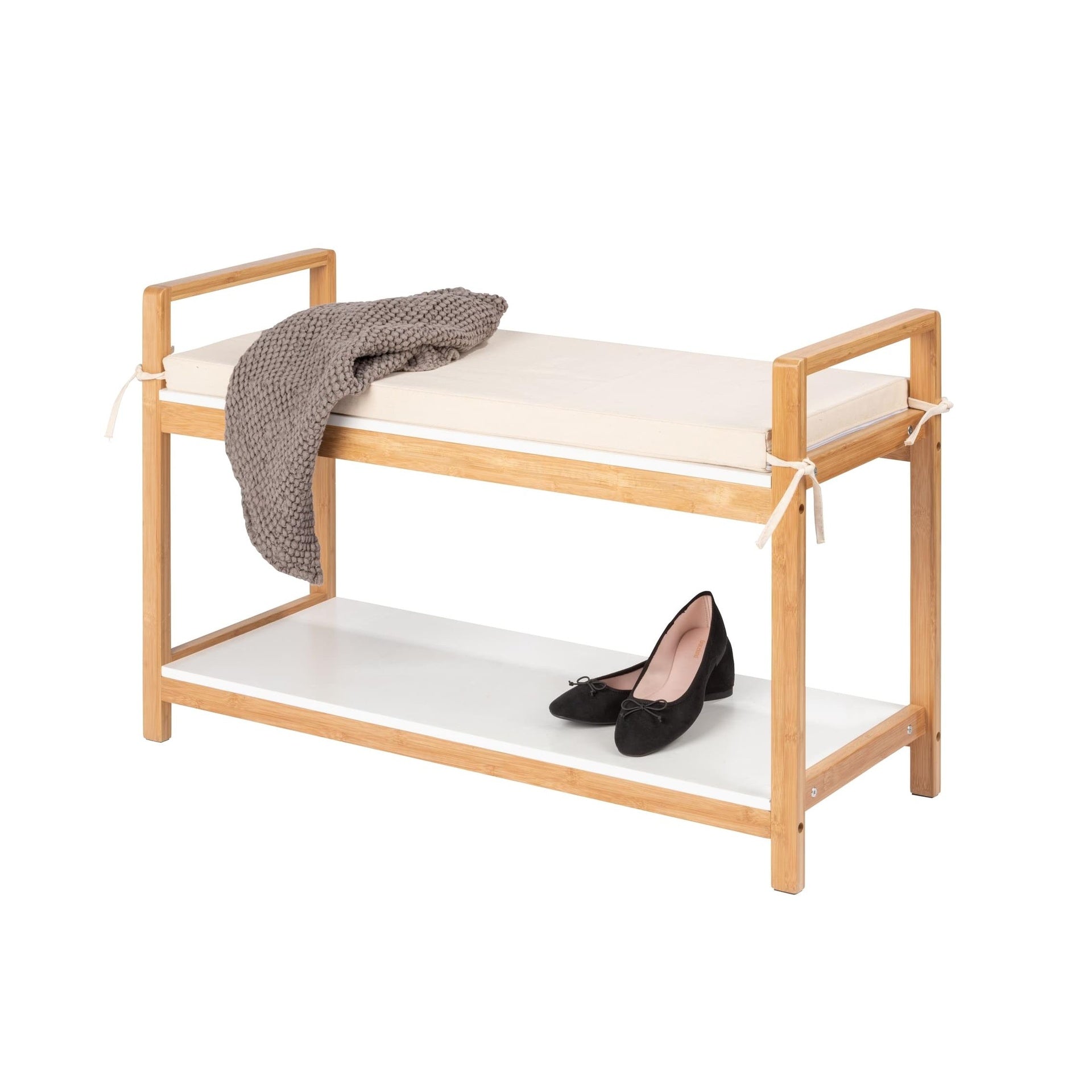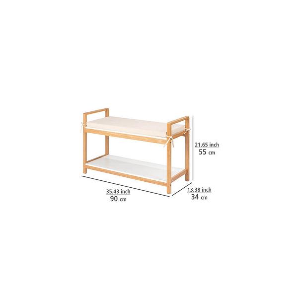 Zapatero fabricado en bambú con asiento acolchado en la parte superior.