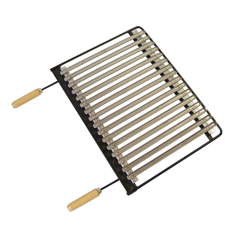 - Parrilla tipo argentino en forma de v con puños de madera, canaliza la grasa hasta la parte delantera, para que la grasa no caiga encima del carbón.