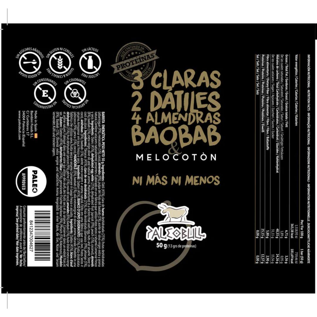 Toda la información sobre "Barrita energética de melocotón, dátiles y almendras Paleobull Muscle Bar 50 g"