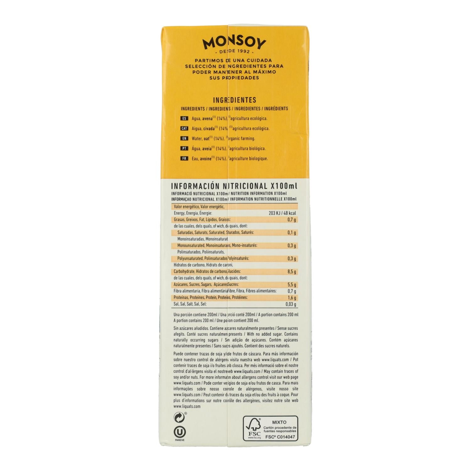 Toda la información sobre "Bebida BIO de avena sin gluten Monsoy 1 L"