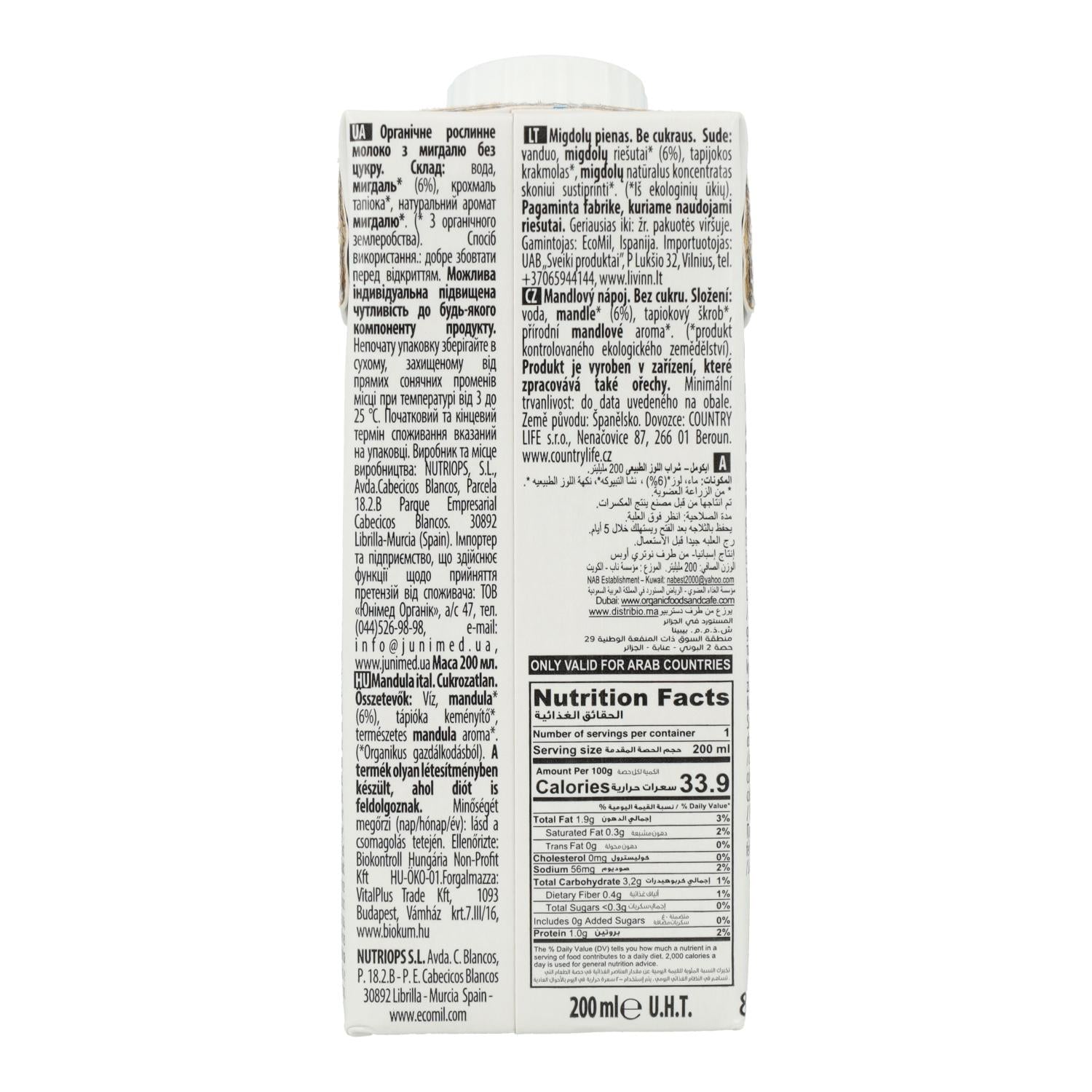 Toda la información sobre "Bebida de Almendra Natural sin azúcar Bio Ecomil 200 ml"