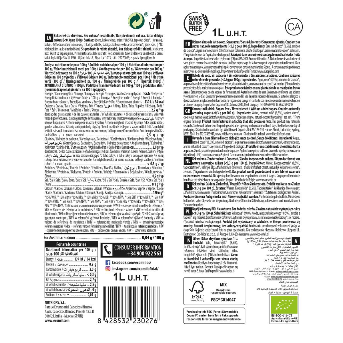 Toda la información sobre "Bebida de Coco Calcio sin azúcar Ecomil 1L"