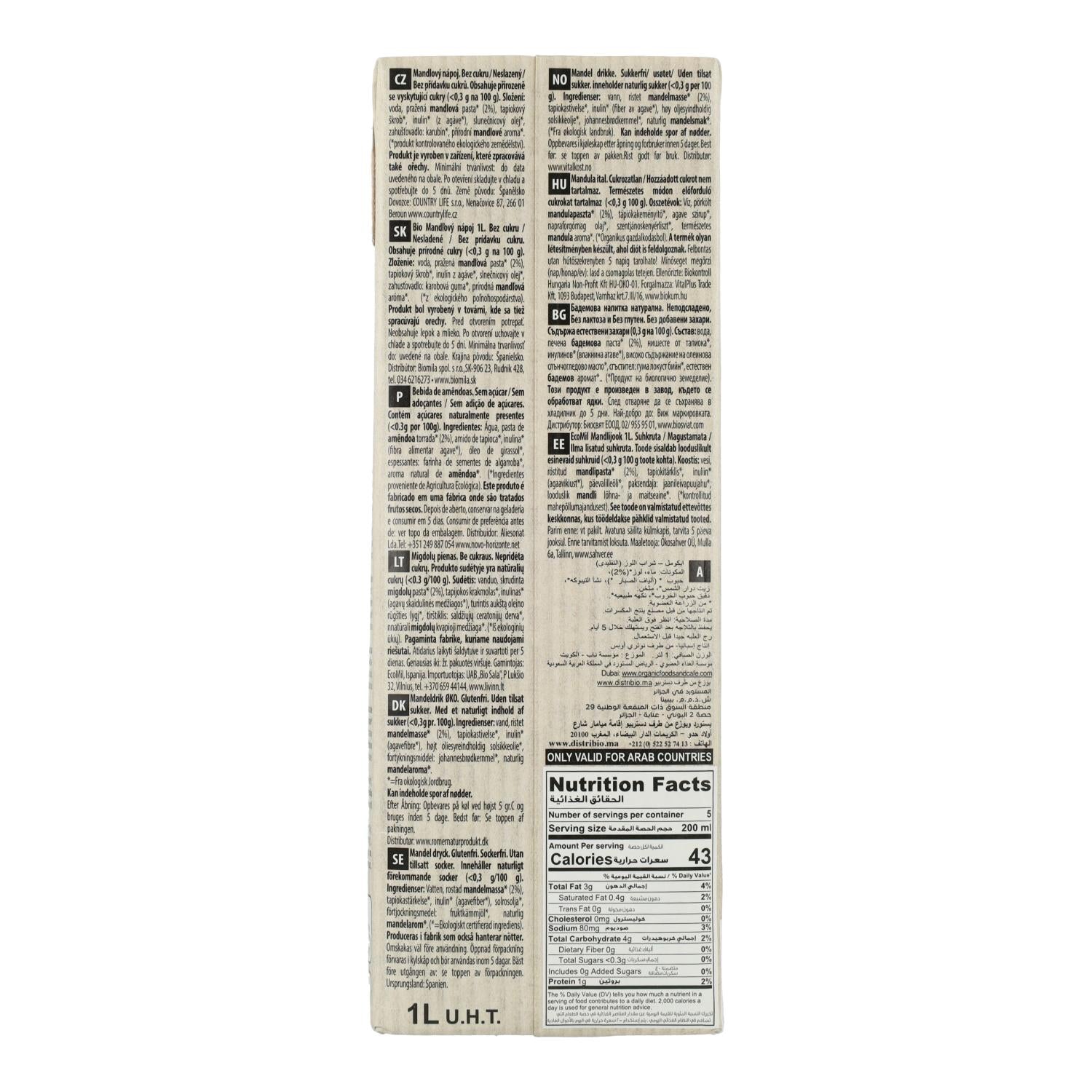 Ingredientes: Agua, almendras* (2%), almidón de tapioca*, inulina* (fibra alimentaria de agave*), aceite de girasol alto oleico*, espesante: goma de semillas de algarrobo* y aroma natural*. Alérgenos: almendras, este producto se fabrica en una planta donde se manipulan frutos secos, cereales que contienen gluten (a saber: trigo, centeno, cebada, avena, espelta, kamut o sus variedades híbridas y productos derivado) y Soja y productos a base de soja. . *Ingredientes procedentes de la Agricultura Ecológica.