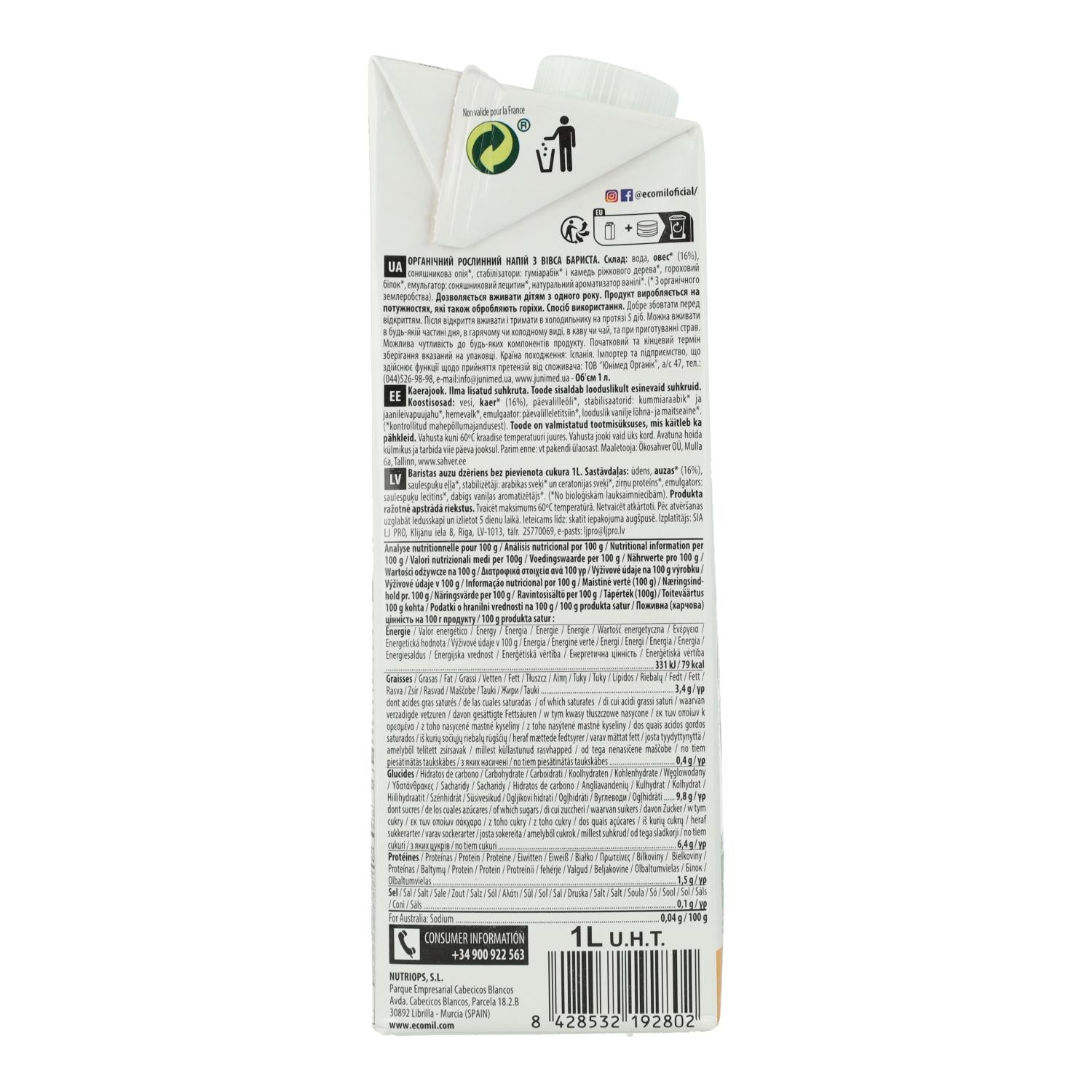 Toda la información sobre "Bebida vegetal Barista Avena BIO EcoMil 1 L"
