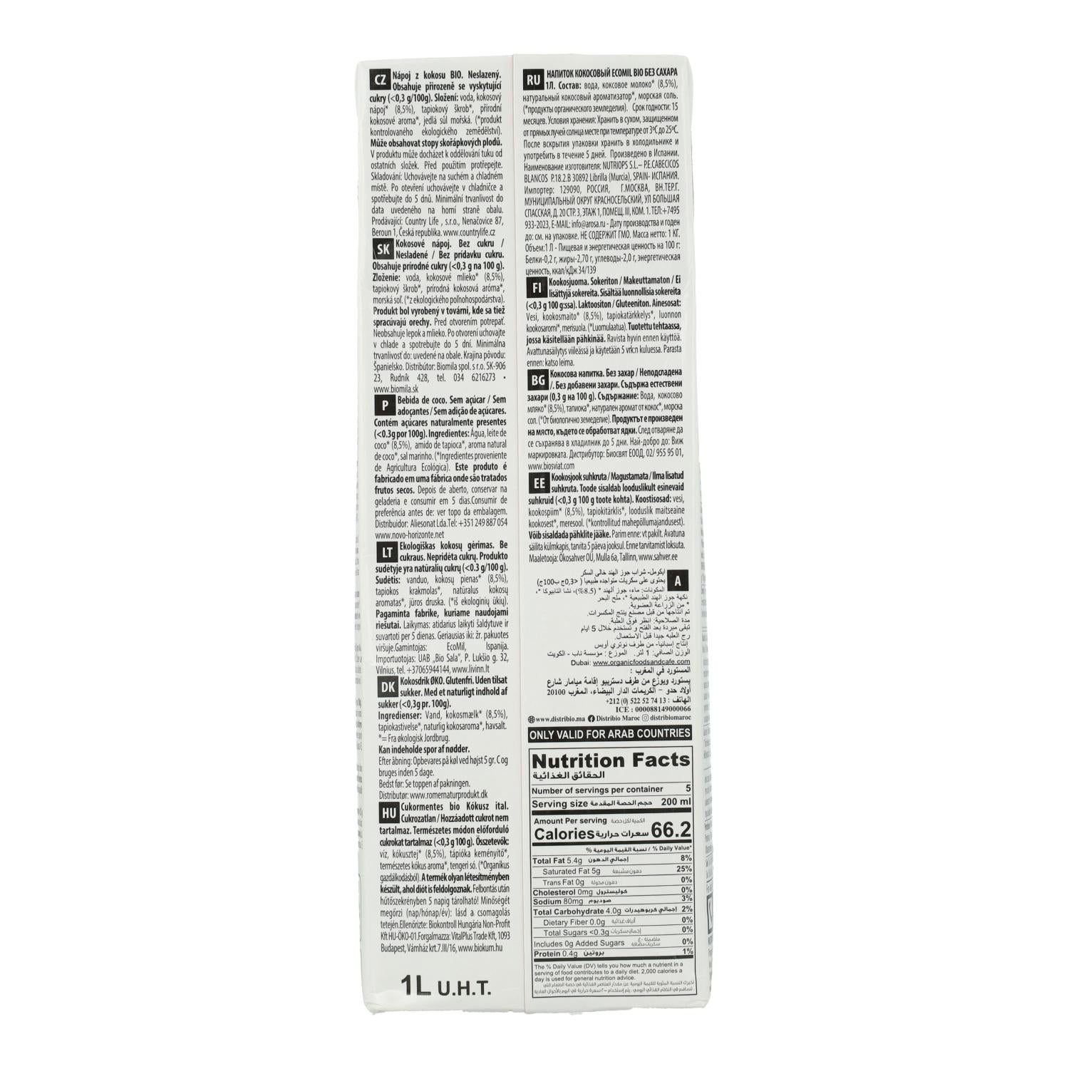 Toda la información sobre "Bebida vegetal de coco sin azúcar, sin gluten y sin lactosa Ecomil 1L"