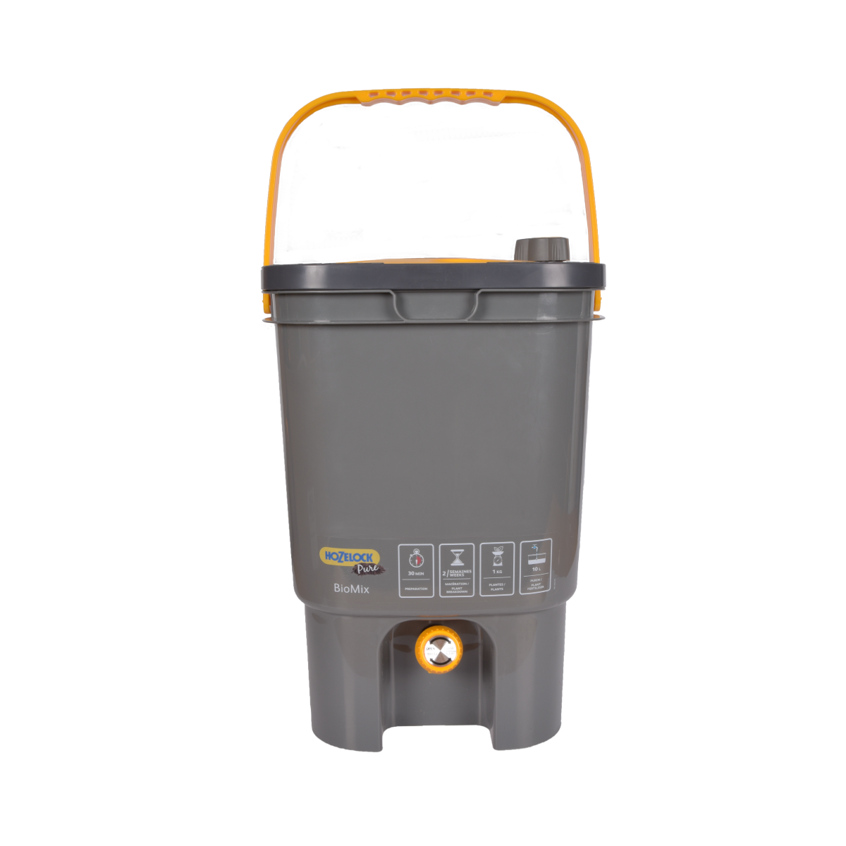 Filtro y grifo integrados – Facilita la retirada de los restos de plantas y el vaciado del líquido resultante sin salpicaduras. El abono liquido resultante, rico en nutrientes, se puede usar de forma segura en todas las plantas de su terraza o jardín. Los residuos sólidos sobrantes (restos solidos de las plantas usadas en el BioMix) son un activador de primera calidad para su compostadora de abonos sólido.