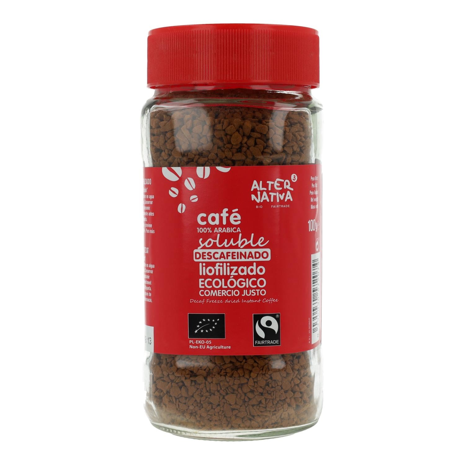 - Café soluble liofilizado descafeinado 100 % Arábica, de cultivo ecológico y comercio justo