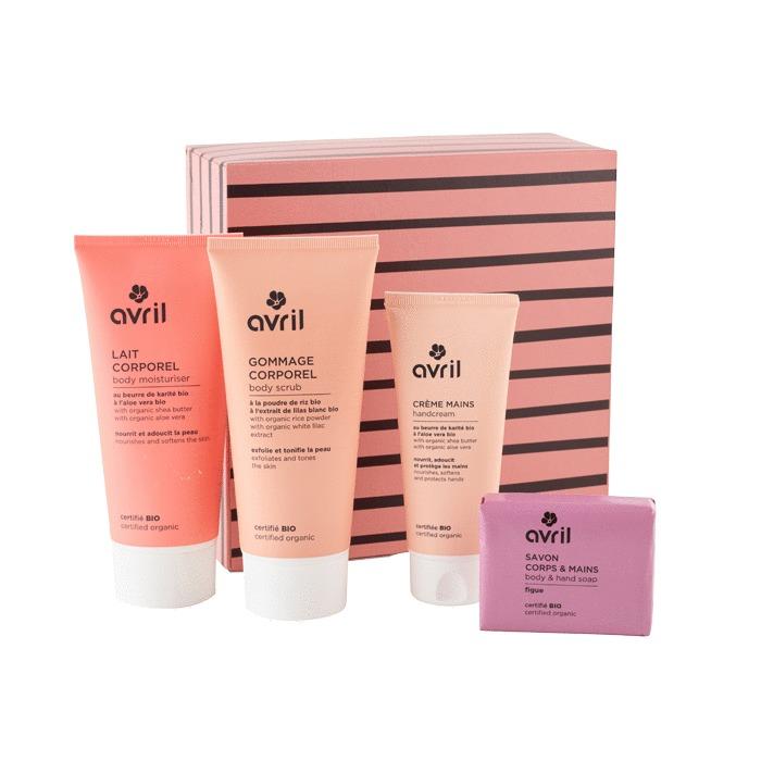 Aquí tienes una caja envolvente con una selección de productos para el cuidado del cuerpo: un exfoliante corporal, una leche corporal, una crema de manos, un jabón corporal y de manos de higo en una caja de cartón reciclado.