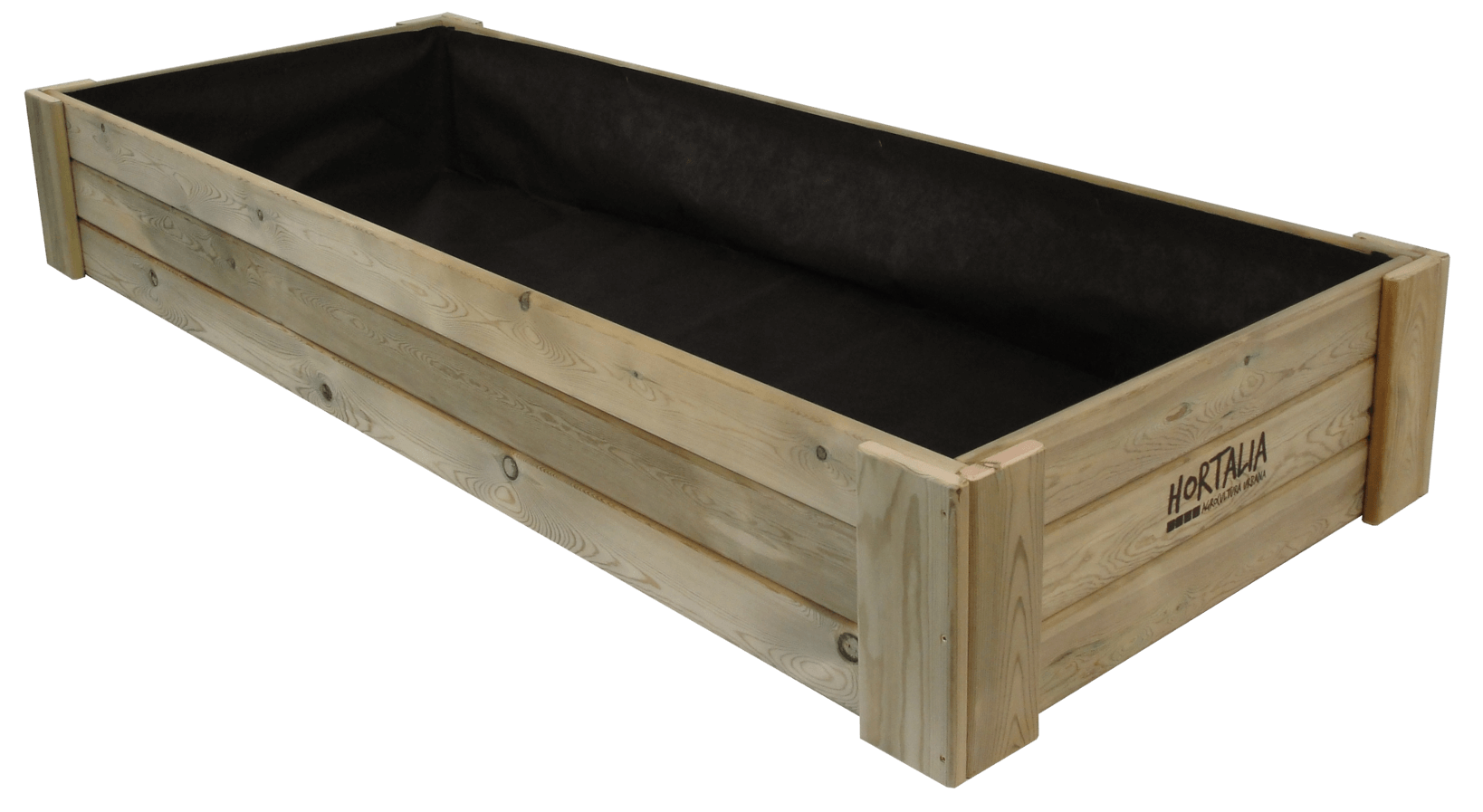 Cajón de cultivo de madera tratada 200x80x40 ideal para huertos urbanos funcionales a ras de suelo.