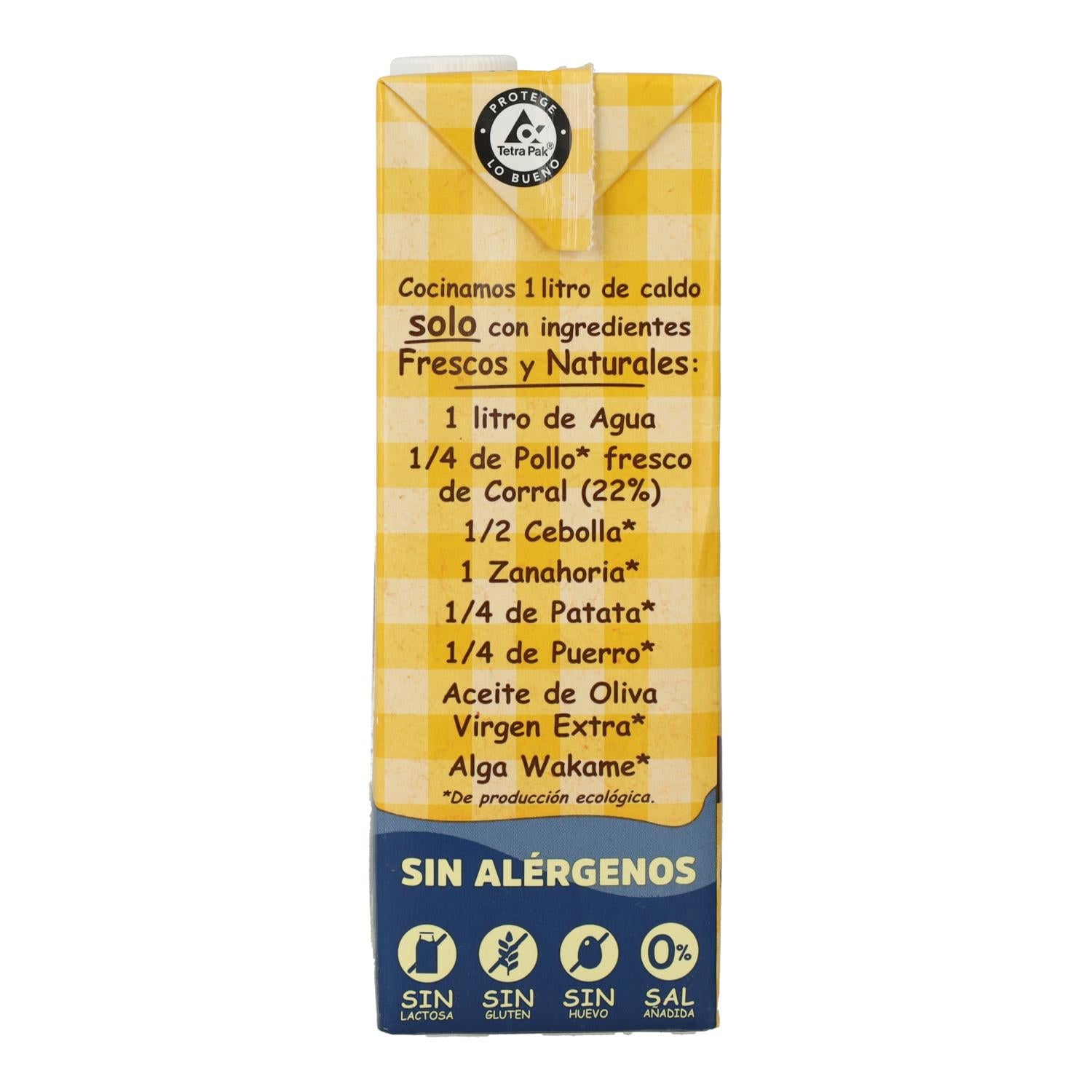 Agua, pollo fresco de corral (22 %), cebolla, zanahoria, puerro, patata o col, apio, aceite de oliva virgen extra, alga wakame.