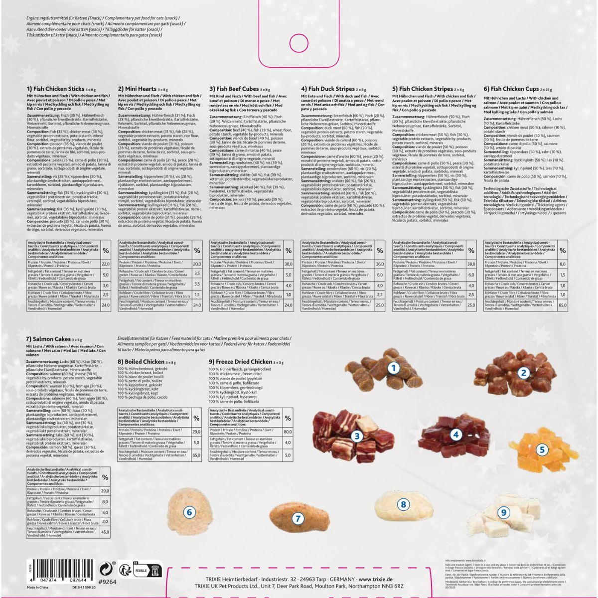 - Fish Chicken Sticks: pescado (35 %), pollo (30 %), extractos proteicos vegetales, almidón de patata, harina de trigo, sorbitol, subproductos vegetales, minerales.