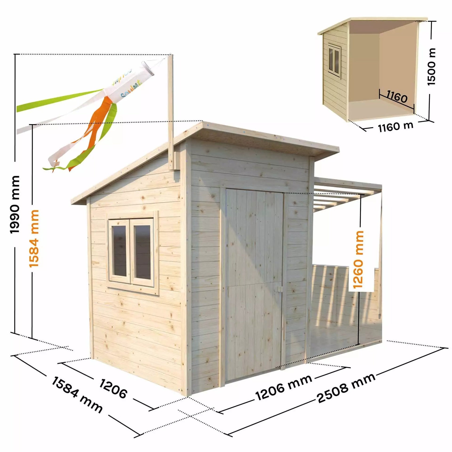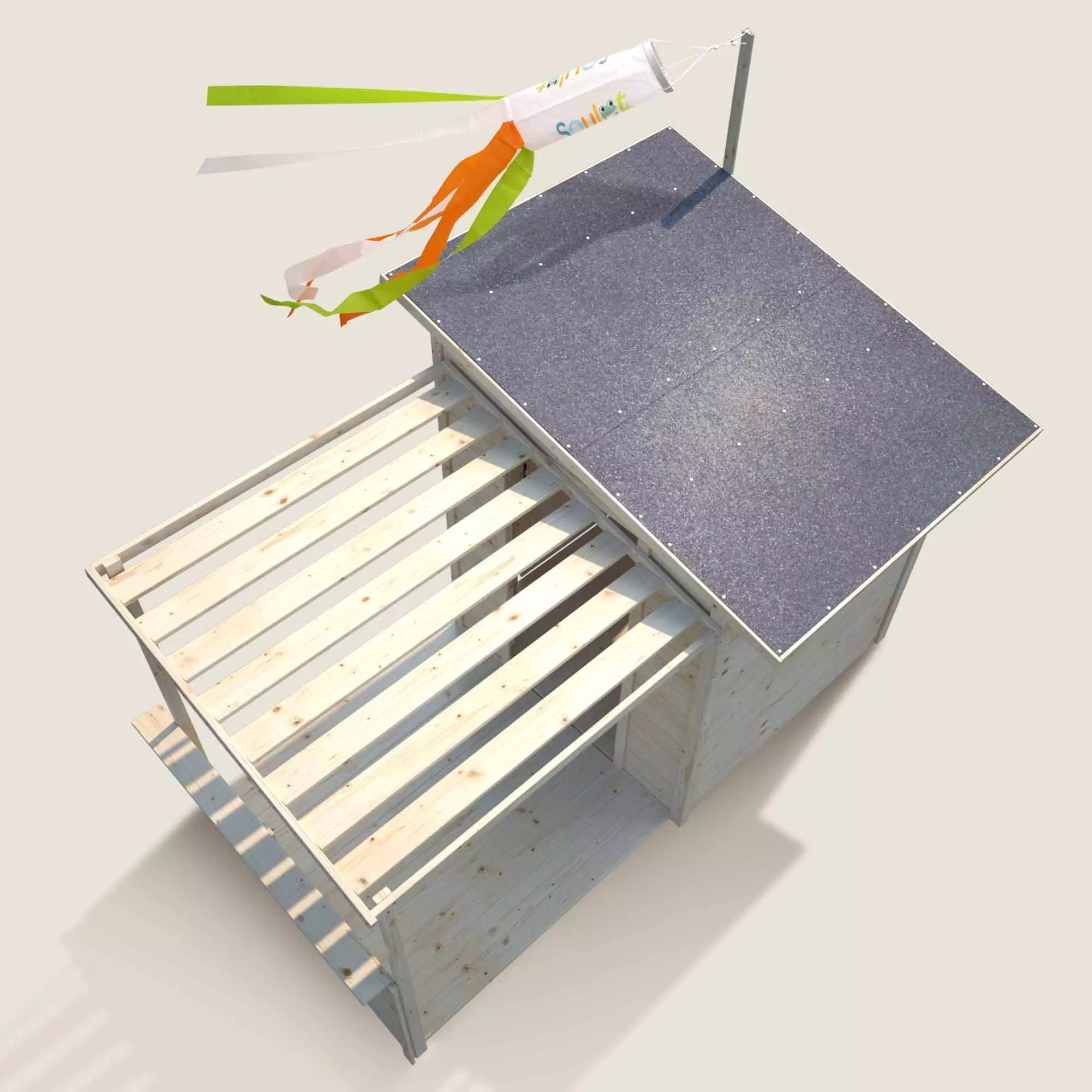 Adosada a la cabina, la pérgola ofrece un espacio protegido para los niños que apreciarán su aspecto interior/exterior. Una puerta en el lateral de la cabina comunica directamente con este espacio adyacente para una comodidad de juego óptima.