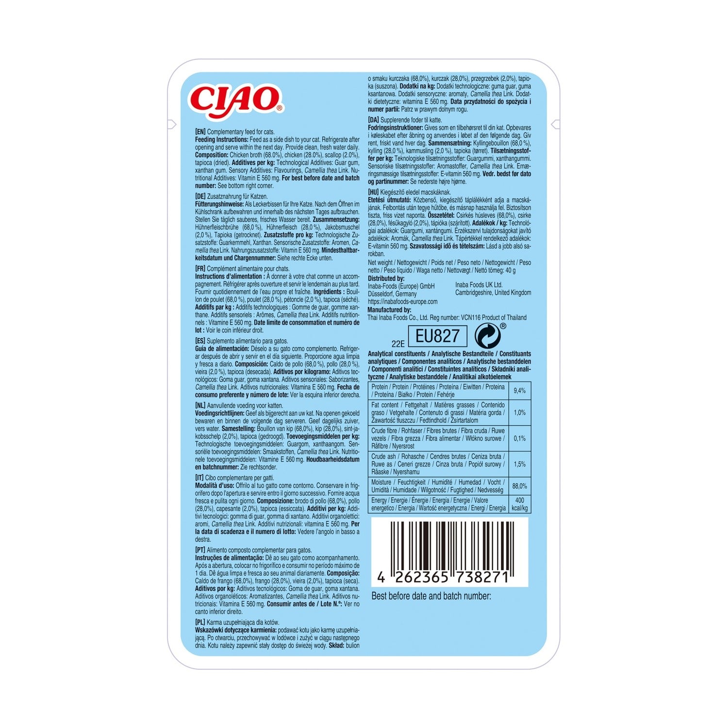 Composición: Caldo de pollo (68%), pollo (15%), vieira (2%), tapioca desecada, sabores naturales, goma guar, goma xantan, suplemento de vitamina E, extracto de té.