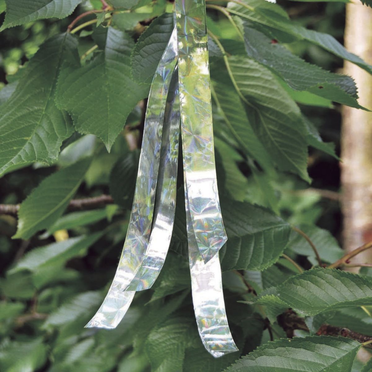 En el huerto o en los arboles fruteros, los pájaros pueden causar muchos estragos. Esta cinta lleva reflejos holográficos que ahuyentan a los pájaros.