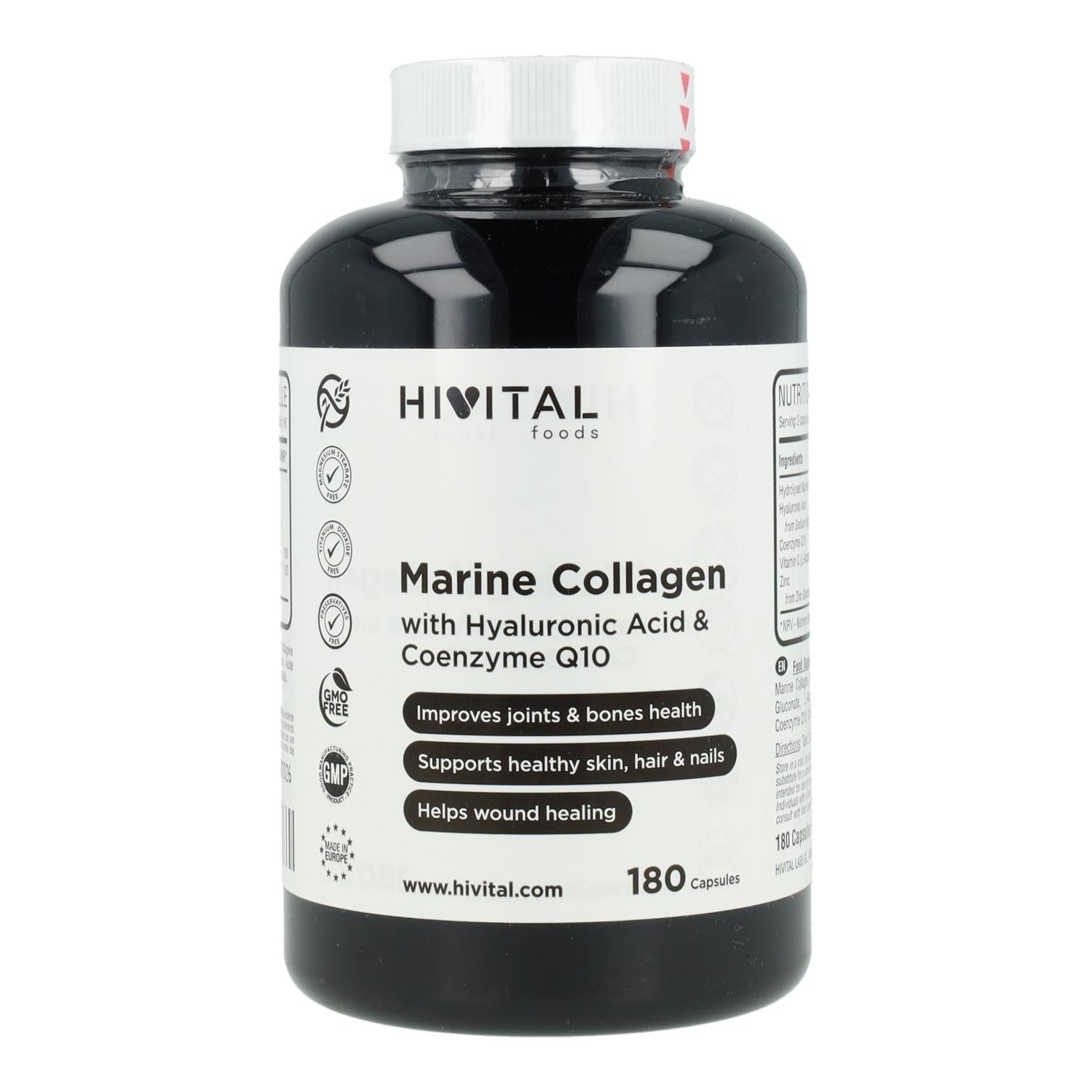 Toda la información sobre "Colágeno Marino con Ácido Hialurónico, Coenzima Q10, Vitamina C y Zinc Hivital 180 cápsulas"