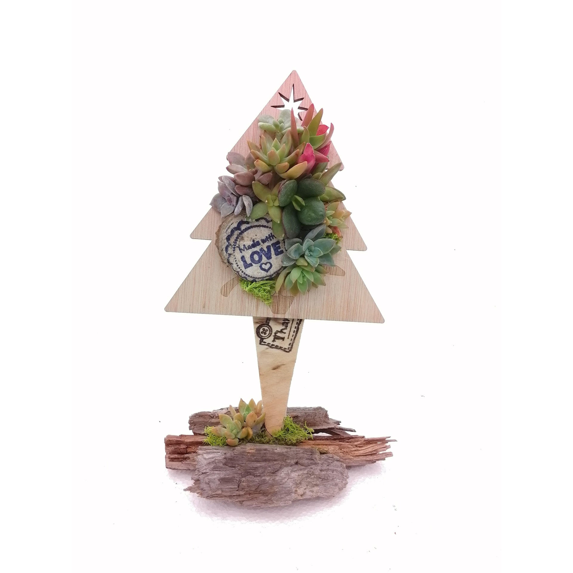 Composición realizada con esquejes de plantas crasas de diferentes variedades y colores sobre una abeto tallado en madera natural.