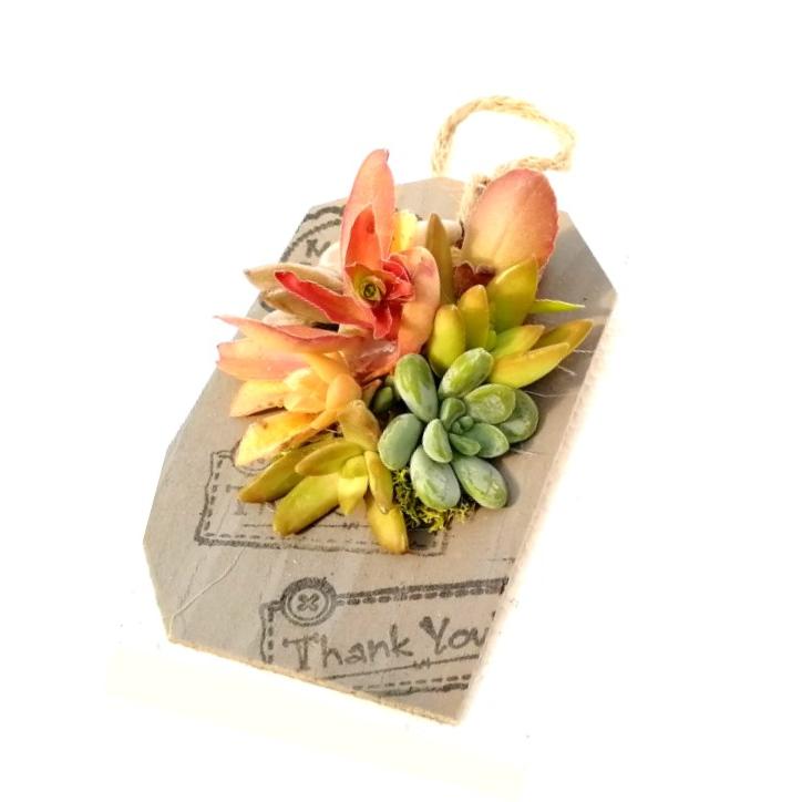 Composición realizada con esquejes de plantas crasas de diferentes variedades y colores sobre una etiqueta fabricada en madera natural.