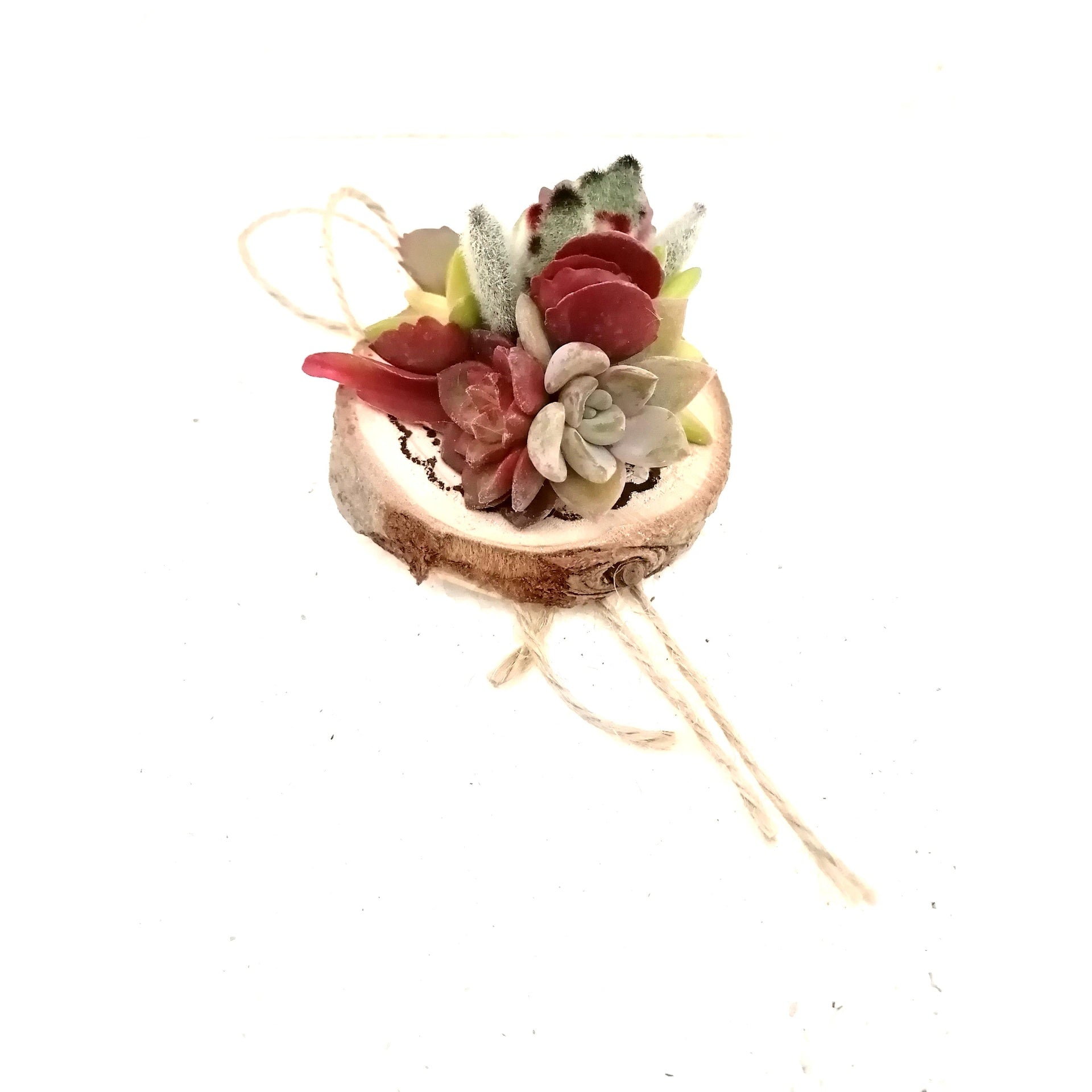 Composición realizada con esquejes de plantas crasas de diferentes variedades y colores sobre una rodaja de un tronco de madera natural