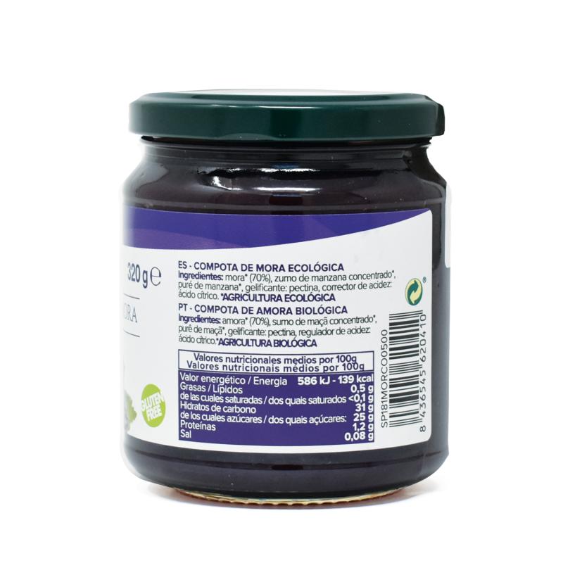 Compota de mora procedente de agricultura ecológica certificada. Obtenida de la cocción de la fruta y su mezcla con concentrado de manzana. Con un mínimo de un 60-70% de la mejor fruta. Compota untable ideal para el desayuno o la merienda. Perfecta también para la elaboración de postres. Sin azúcares añadidos.