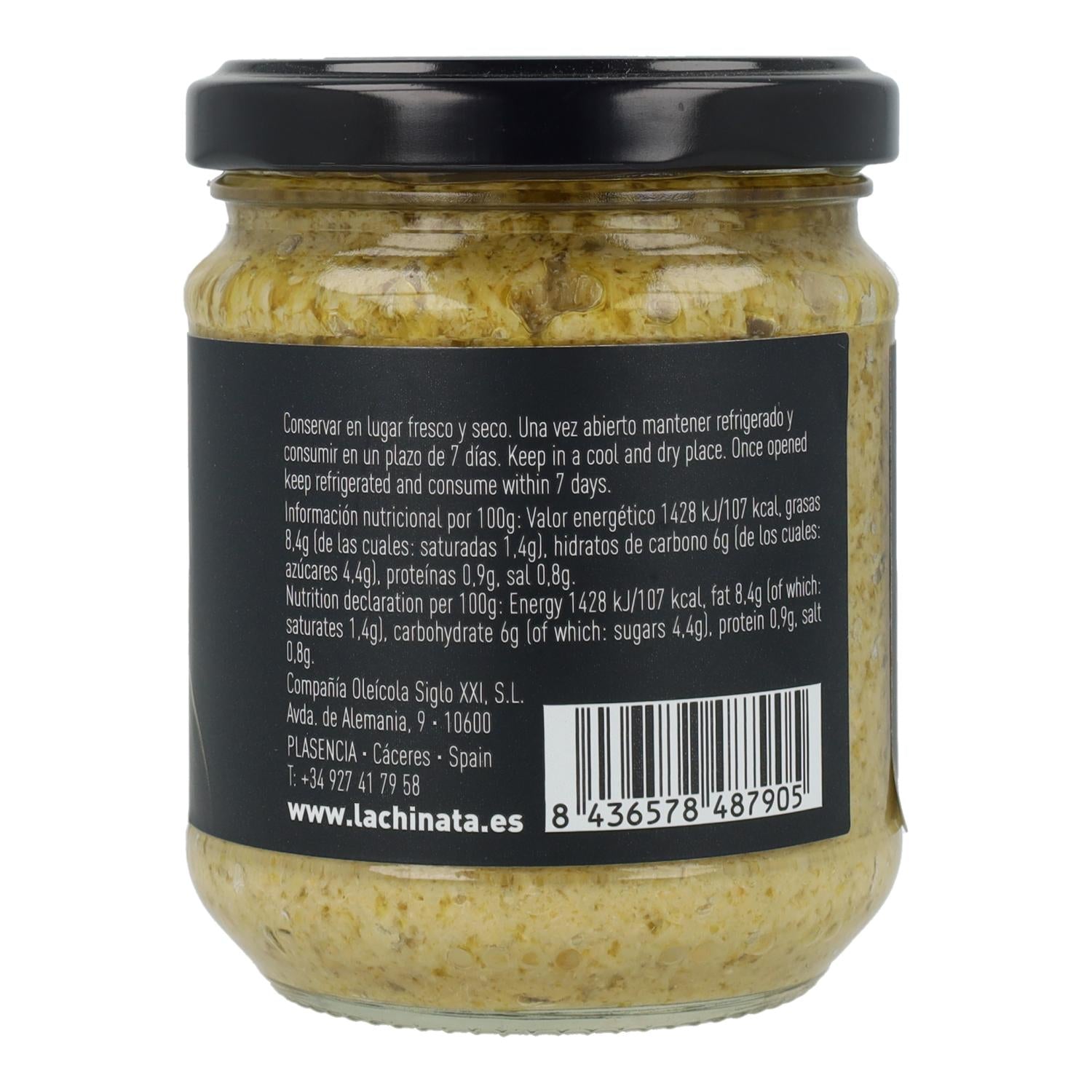 Alcachofa (68%), aceite de oliva virgen extra (21,7%), albahaca, anacardo, queso (leche de vaca, cuajo), sal azúcar, corrector de la acidez: E330 (ácido cítrico).