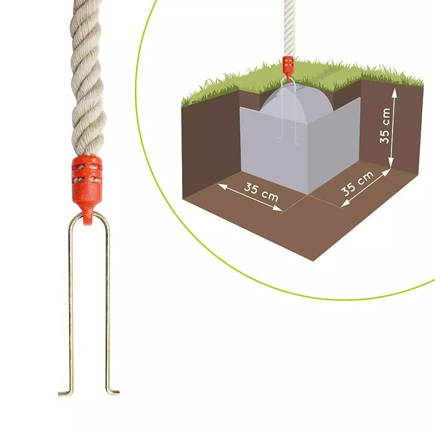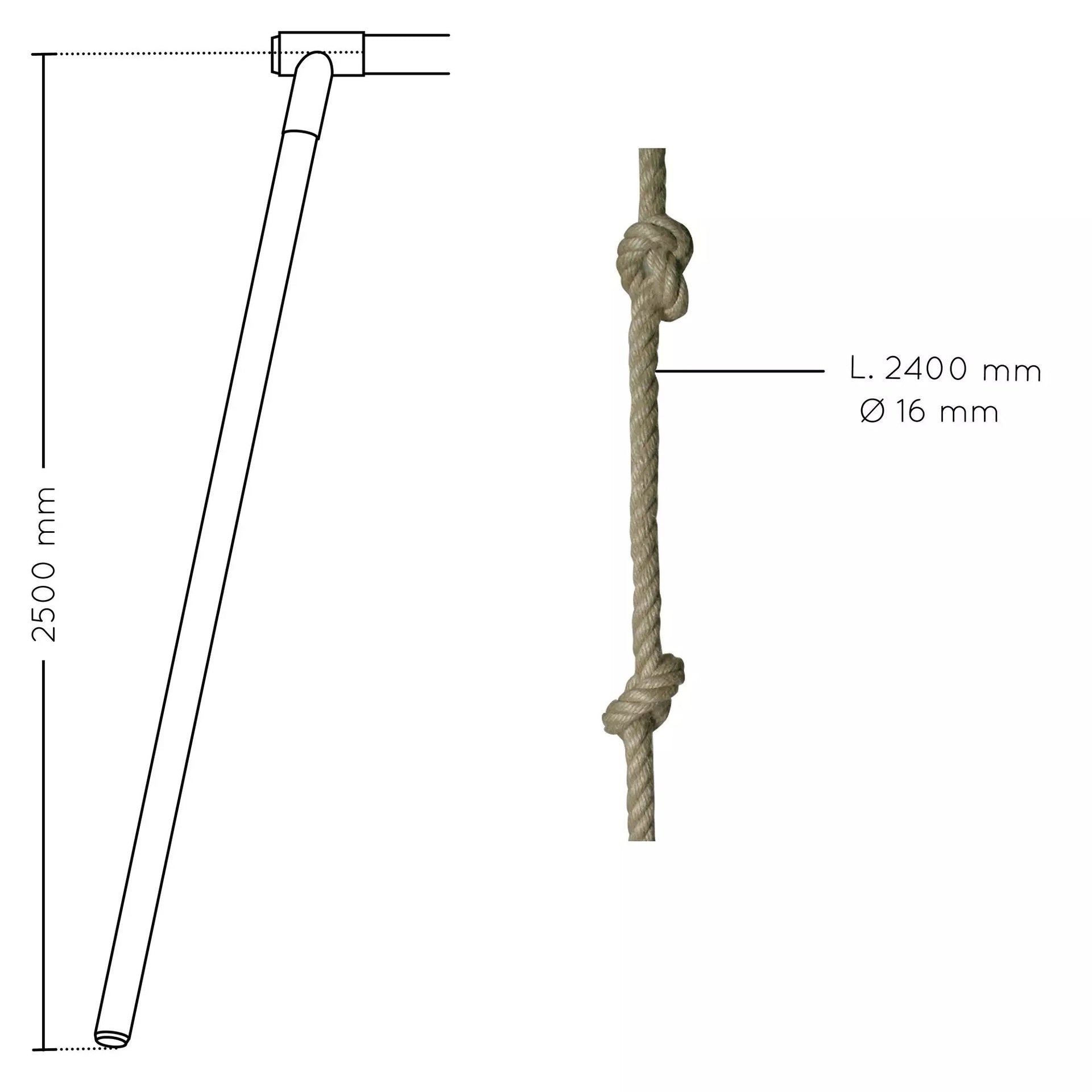 Esta cuerda posee un diámetro de 16 mm. Mide 2,4 de largo y es adecuada para pórticos de 2,5 m de altura. Se dirige a niños de 3 a 12 años, de 5 Kg máximo. Está fabricada con polipropileno, con imitación de cáñamo.