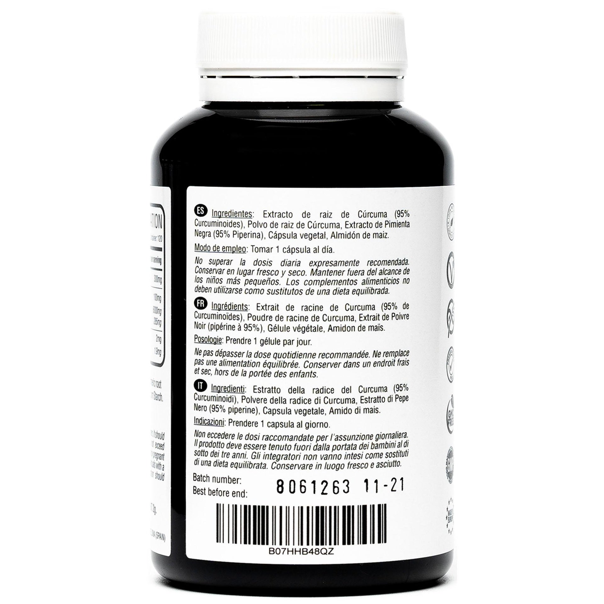 Excelente fórmula a base de Extracto de raíz de Cúrcuma (95% Curcuminoides), Polvo de raíz de Cúrcuma y Extracto de Pimienta negra (95% Piperina), que favorece la circulación sanguínea, mejora la salud cardiovascular, y combate la inflamación y el dolor articular. Gran cantidad de producto al mejor precio: Ofrecemos 120 cápsulas veganas por bote, suministro para 4 meses.