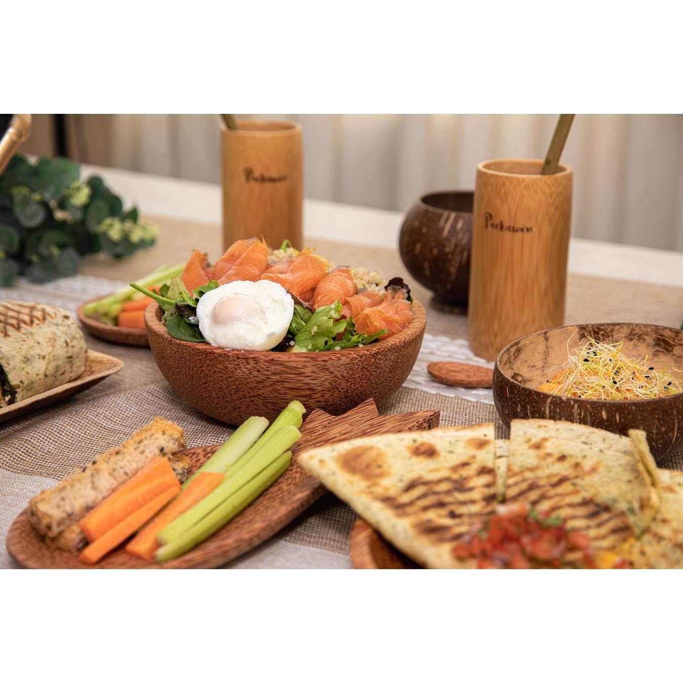 Vajilla reutilizable 100% compostable.Esta vajilla de madera de cocotera no solo es totalmente ecológica sino que ofrece un distintivo look a tu mesa. Ofrece Açai bowls, smoothies, poke bowls, ensaladas o yogur en esta preciosa ensaladera de madera de cocotera y sorprende con una estética natural y sofisticada.