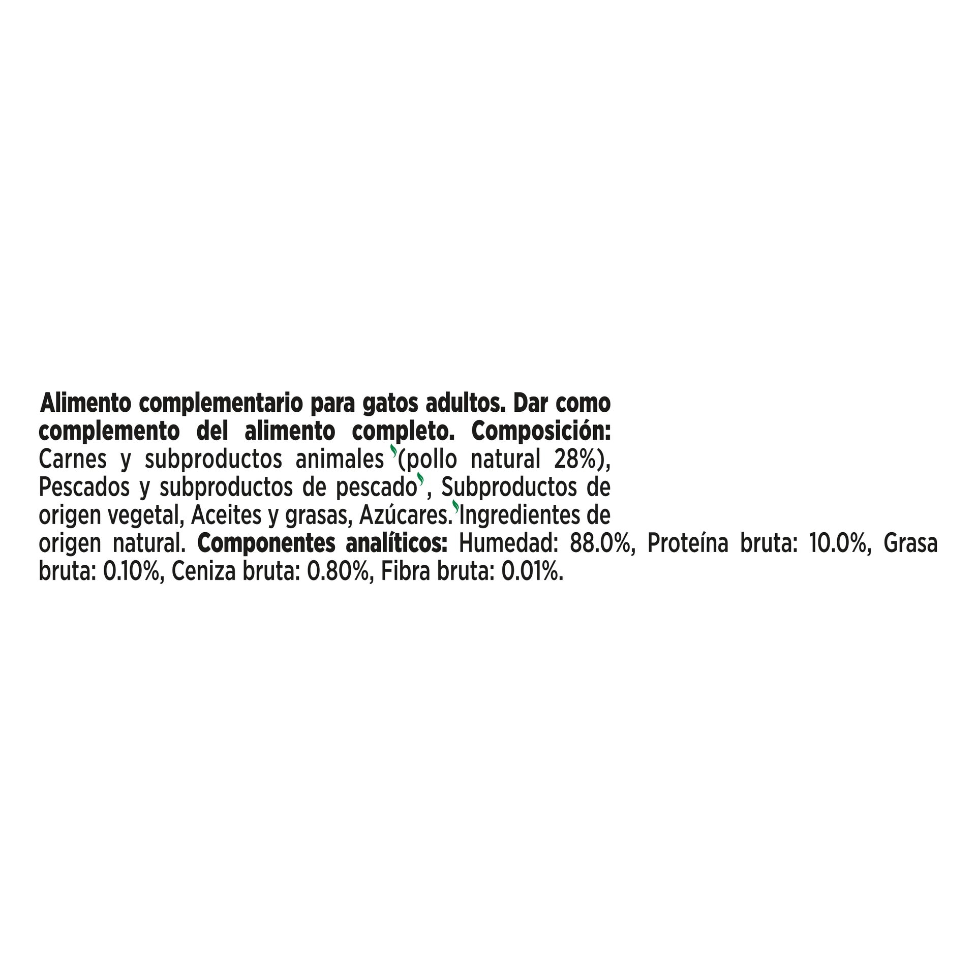 - Este producto es una comida complementaria con un alto grado de humedad: parte de la ingestión de agua díaria recomendada será proporcionada a tu gato través del consumo de este producto.