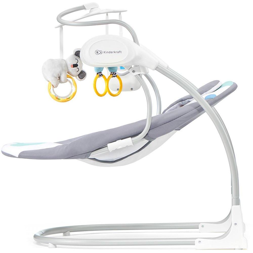 Columpio eléctrico con panel de control, carrusel y tres juguetes que estimulan el desarrollo y la curiosidad.