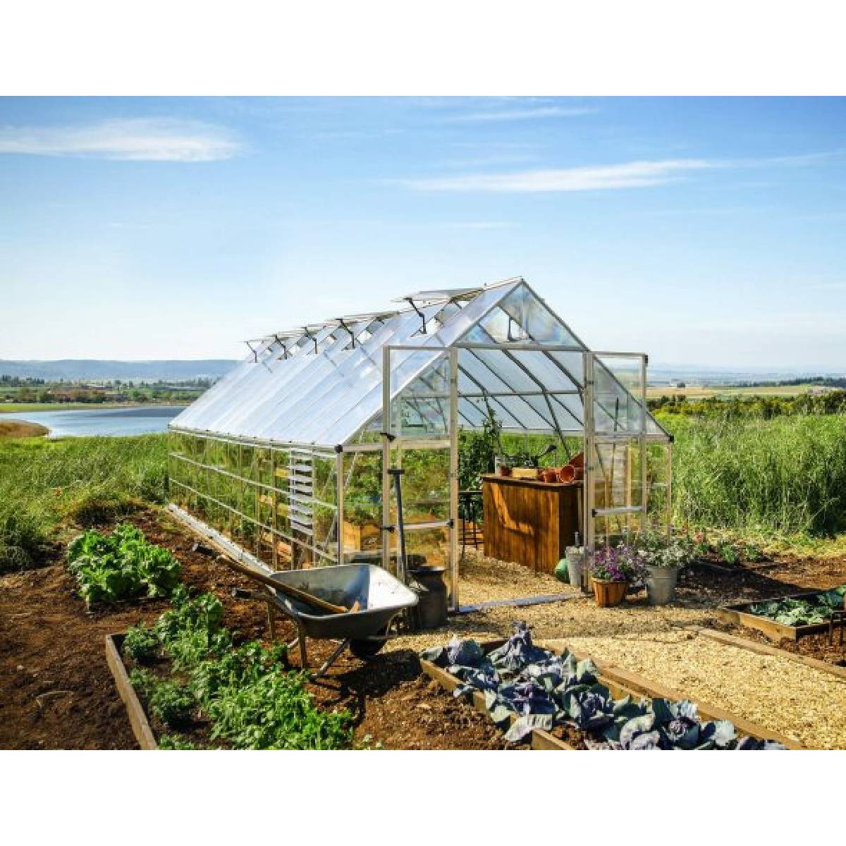 La superficie de trabajo extragrande ofrece mucho espacio para cultivar hortalizas y hierbas y almacenar las herramientas y accesorios necesarios. El invernadero Balance Greenhouse también es muy accesible, ya que cuenta con amplias puertas dobles y un umbral bajo para poder entrar y salir con carretillas y tener espacio suficiente para trasladar grandes bandejas de plantas.