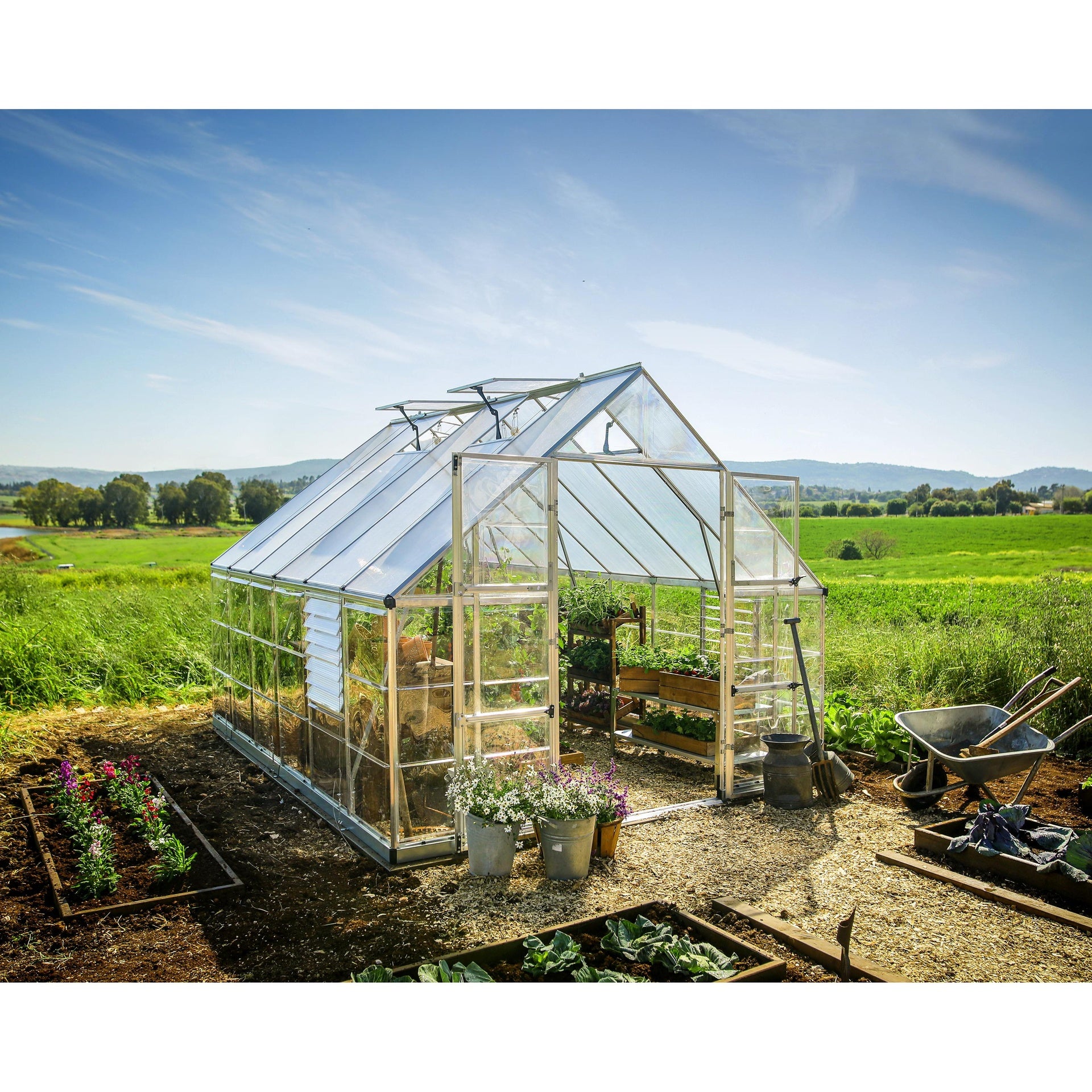 • Características adicionales: un sistema de canalones incorporado drena el agua de lluvia para el riego, y las ventanas de ventilación manual favorecen la circulación del aire, permiten regular la humedad, la temperatura y la ventilación, y proporcionan refrigeración en los días calurosos.