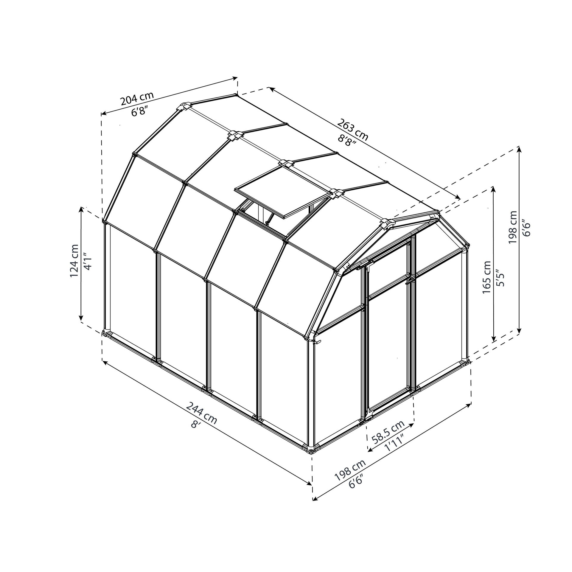 El invernadero Palram - Canopia | Eco Grow es la elección clásica para quienes cultivan en invernaderos. El invernadero de bricolaje en forma de granero ofrece un aspecto clásico, un espacio confortable y un excelente aislamiento térmico. La puerta de una sola bisagra puede instalarse tanto en el lado izquierdo como en el derecho y se mantiene abierta fácilmente gracias al cierre magnético de la puerta. El respiradero del techo proporciona ventilación para controlar la temperatura y la humedad incluso cuando la puerta está cerrada. Las tiras de sellado de goma y el marco de resina de alta resistencia con protección UV proporcionan un mejor aislamiento y mejoran el control de la temperatura. Sus plantas están protegidas tanto de las condiciones climáticas extremas como del sol, ya que los paneles del techo de policarbonato de doble pared de 4 mm de grosor, prácticamente irrompibles, y los paneles laterales de doble pared de 6 mm de grosor, bloquean los dañinos rayos UV y difunden más del 80 % de la luz solar para obtener una luz suave y uniforme.