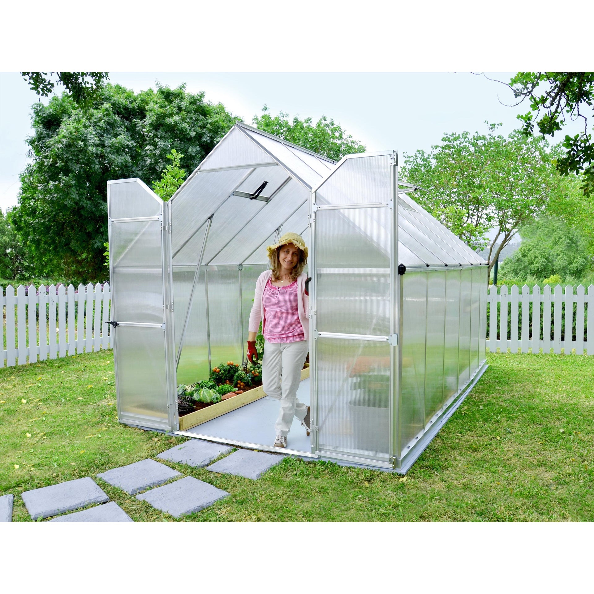 La esencia de la jardinería espaciosa. Este invernadero cuenta con espacio alto para la cabeza y 93 pies cuadrados (8,7 metros cuadrados) para mejorar el espacio de trabajo, dos respiraderos para regular la temperatura, la humedad y el flujo de aire y puertas dobles anchas con umbral bajo para que el acceso sea cómodo y fácil. Adicionalmente, incluye una base de acero galvanizado, agregando soporte estructural, estabilidad y alineación. La instalación es fácil y rápida con el sistema de montaje de los paneles deslizantes. Simplemente deslice y bloquee los paneles de policarbonato de pared doble, virtualmente irrompibles, en la estructura del invernadero. Sus plantas disfrutarán de un ambiente aislado, protegido de la fuerte exposición a la luz solar y de excelentes condiciones para la nutrición y el crecimiento. • Paneles de policarbonato de pared doble prácticamente irrompibles, que difunden más del 70% de la luz solar intensa para una luz uniforme y suave