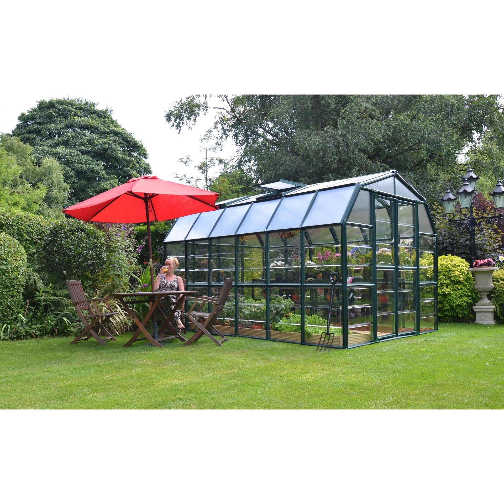 El invernadero Palram - Canopia | Grand Gardener Greenhouse, cuenta con una elegante forma de granero y un diseño de ventanas, lo que hace que su invernadero luzca hermoso incluso antes de plantar. El énfasis en la seguridad es evidente, desde el marco de alta resistencia hasta los paneles de policarbonato extremadamente seguros. El robusto armazón de resina extruida, resistente a la intemperie y protegido contra los rayos ultravioleta, con sus perfiles de techo de aluminio, mejora el aislamiento total y la durabilidad. Las paredes laterales de policarbonato transparente proporcionan una visión clara, mientras que los paneles del techo de doble pared difunden más del 80 % de la luz solar y proporcionan una luz suave y uniforme. La atención al detalle continúa en la construcción del techo, que ofrece mucha altura y más espacio para el jardín, así como en las puertas abatibles, que facilitan la entrada y salida, incluso con grandes bandejas de plantas. El respiradero del techo proporciona una excelente ventilación y retiene el calor cuando las puertas están cerradas. El invernadero Palram - Canopia | Grand Gardener Greenhouse es fácil de montar y es perfecto para los amantes de la jardinería que buscan algo sencillo y bonito.