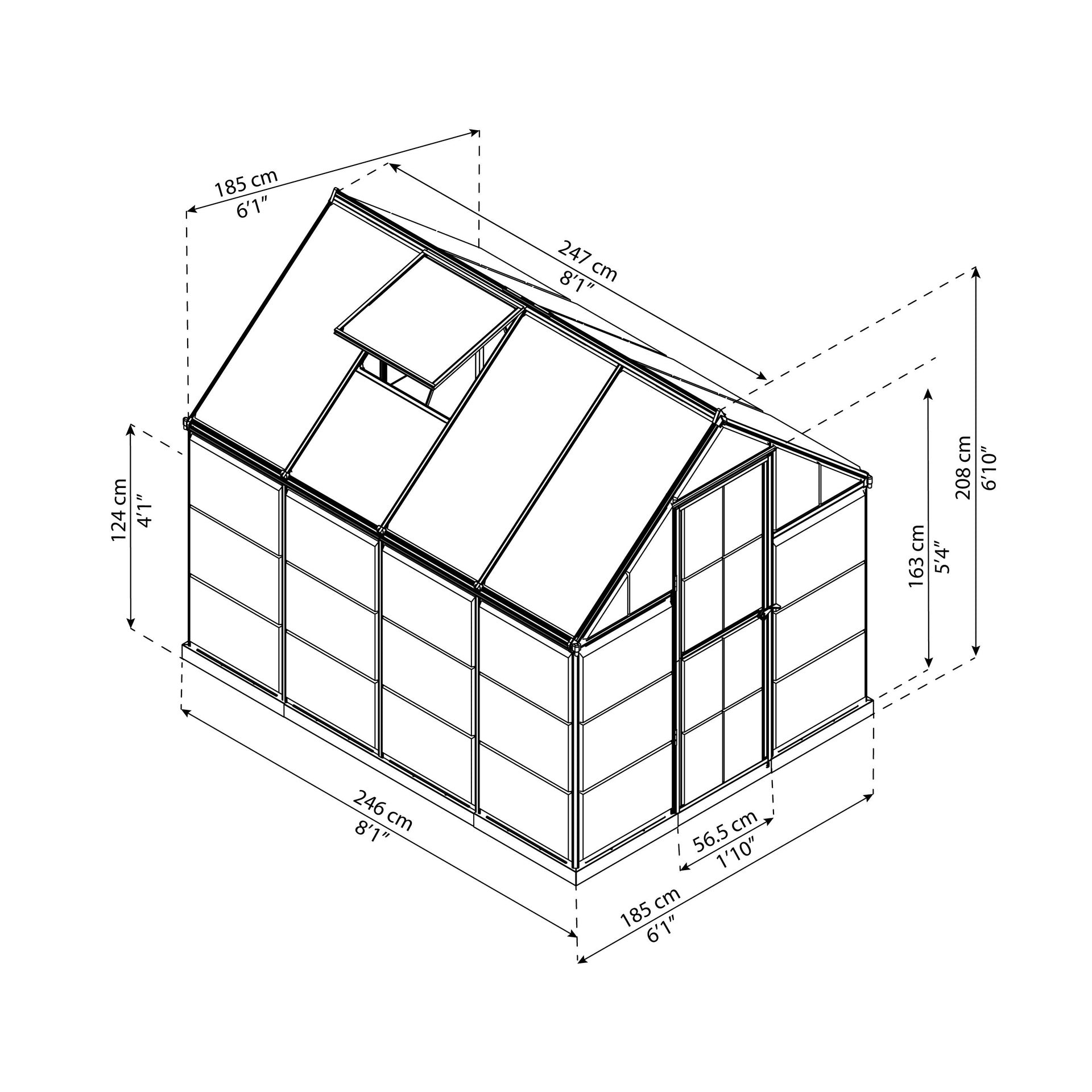 Dos tipos de acristalamiento de policarbonato prácticamente irrompible proporcionan condiciones de cultivo equilibradas Techo: los paneles de policarbonato de pared doble protegen de la exposición a la luz solar intensa Paredes: los paneles de policarbonato transparentes proporcionan más del 90% de transmisión de luz Los paneles bloquean los dañinos rayos UV y están 100%protegidos contra los mismos; no se decoloran, no se fracturan ni se rompen Estructura de aluminio robusta y resistente a la oxidación con recubrimiento de polvo verde que incluye una base de acero galvanizado para mayor estabilidad estructural Base de acero galvanizado incluida, con agujeros designados para anclaje (anclajes no incluidos) para mayor estabilidad estructural Instalación fácil HÁGALO USTED MISMO: sistema de montaje de paneles deslizantes La puerta con bisagras individuales se puede montara la derecha o a la izquierda• Cierre de puerta magnético incluido para mantener abierto el invernadero Manija de puerta con cerradura (candado no incluido)• Sistema de canalón incorporado para el drenaje y recolección de agua efectivos