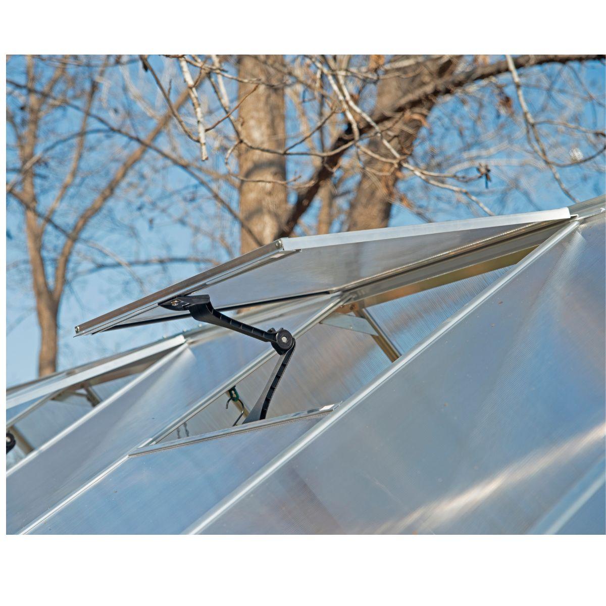 Dos tipos de acristalamiento de policarbonato prácticamente irrompible proporcionan condiciones de cultivo equilibradas Techo: los paneles de policarbonato de pared doble protegen de la exposición a la luz solar intensa Paredes: los paneles de policarbonato transparentes proporcionan más del 90% de transmisión de luz Los paneles bloquean los dañinos rayos UV y están 100%protegidos contra los mismos; no se decoloran, no se fracturan ni se rompen Estructura de aluminio robusta y resistente a la oxidación con recubrimiento de polvo verde que incluye una base de acero galvanizado para mayor estabilidad estructural Base de acero galvanizado incluida, con agujeros designados para anclaje (anclajes no incluidos) para mayor estabilidad estructural Instalación fácil HÁGALO USTED MISMO: sistema de montaje de paneles deslizantes La puerta con bisagras individuales se puede montara la derecha o a la izquierda• Cierre de puerta magnético incluido para mantener abierto el invernadero Manija de puerta con cerradura (candado no incluido)• Sistema de canalón incorporado para el drenaje y recolección de agua efectivos