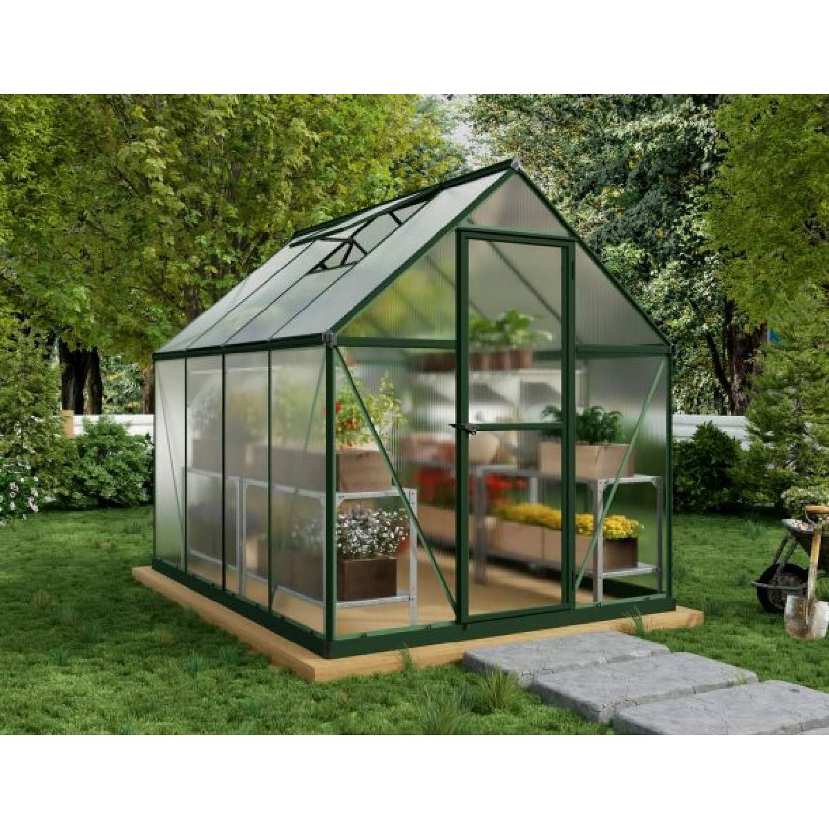 El invernadero Mythos le ayuda a mantener las temperaturas niveladas y a dispersar la luz solar para las plantas sensibles. Es un invernadero de diseño elegante, con paneles de policarbonato de pared doble, prácticamente irrompibles, y un marco de aluminio resistente a la oxidación con recubrimiento de polvo verde de alta resistencia. El invernadero Mythos es elegante y práctico, perfectamente diseñado para adaptarse a espacios más pequeños y proteger sus plantas de los elementos para que pueda cultivar durante más meses al año • Paneles de policarbonato de pared doble, prácticamente irrompibles, que proporcionan más del 70% de transmisión de luz