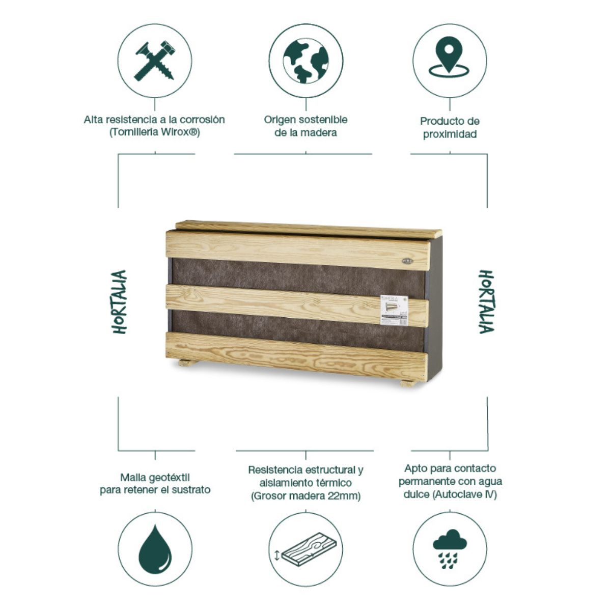Este modelo nos permite tres marcos de plantación: dos en la cara horizontal y uno en la parte superior. Además, ya viene montado, con la malla geotextil colocada en su interior. Listo para poner el sustrato, semillas o plantel y ¡empezar a disfrutar!