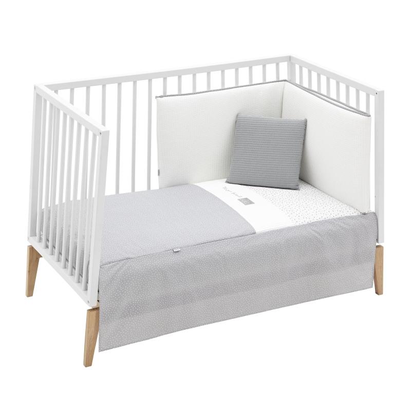 La colcha, es la prenda que viste la cuna y cumple el cometido de protección contra el frío como si de una manta o una funda nórdica se tratara. Su cualidad de tener un relleno desenfundable la convierte en una prenda versátil para ser utilizada en invierno y en verano y también ofrece la ventaja de ser lavada con facilidad. Dispone de 3 volantes que cumplen la función de vestir la cuna. El protector fabricado con tejido cuyo interior va acolchado con fibra hueca, amortigua los posibles golpes del bebe contra la cuna.