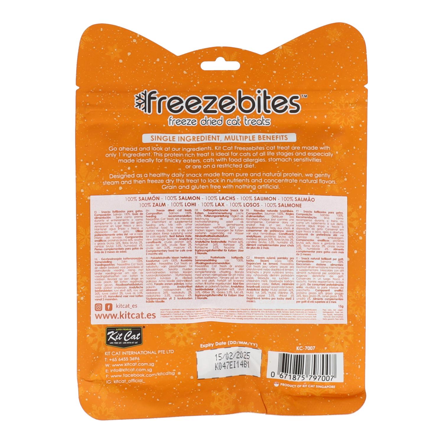 Toda la información sobre "Kit Cat FreezeBites - Salmón 15 g Snack liofilizado natural para gatos"