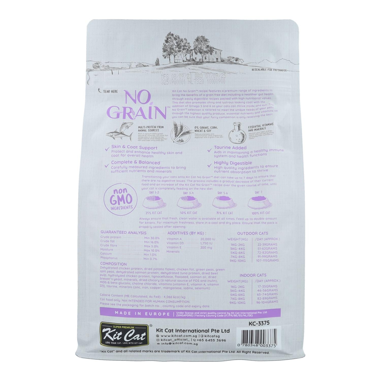 La transición a nuestro pienso No Grain puede llevar hasta 7 días para garantizar que no haya problemas digestivos. El proceso incluye una disminución gradual de su alimento actual y un aumento del pienso Kit Cat durante el transcurso del tiempo dado, hasta que tu gato se esté alimentando completamente con la nueva dieta.
