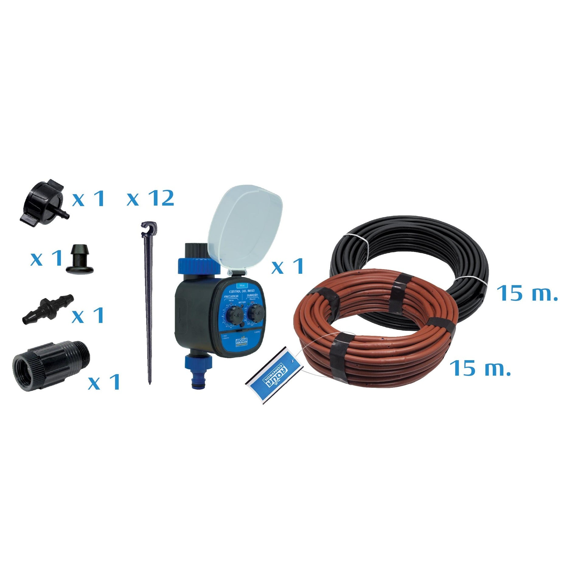 Kit especialmente adaptado para el diseño de sistemas de riego adaptados al huerto urbano de mesas de cultivo y jardineras, con programador automático incluido para facilitar la tarea del riego.
