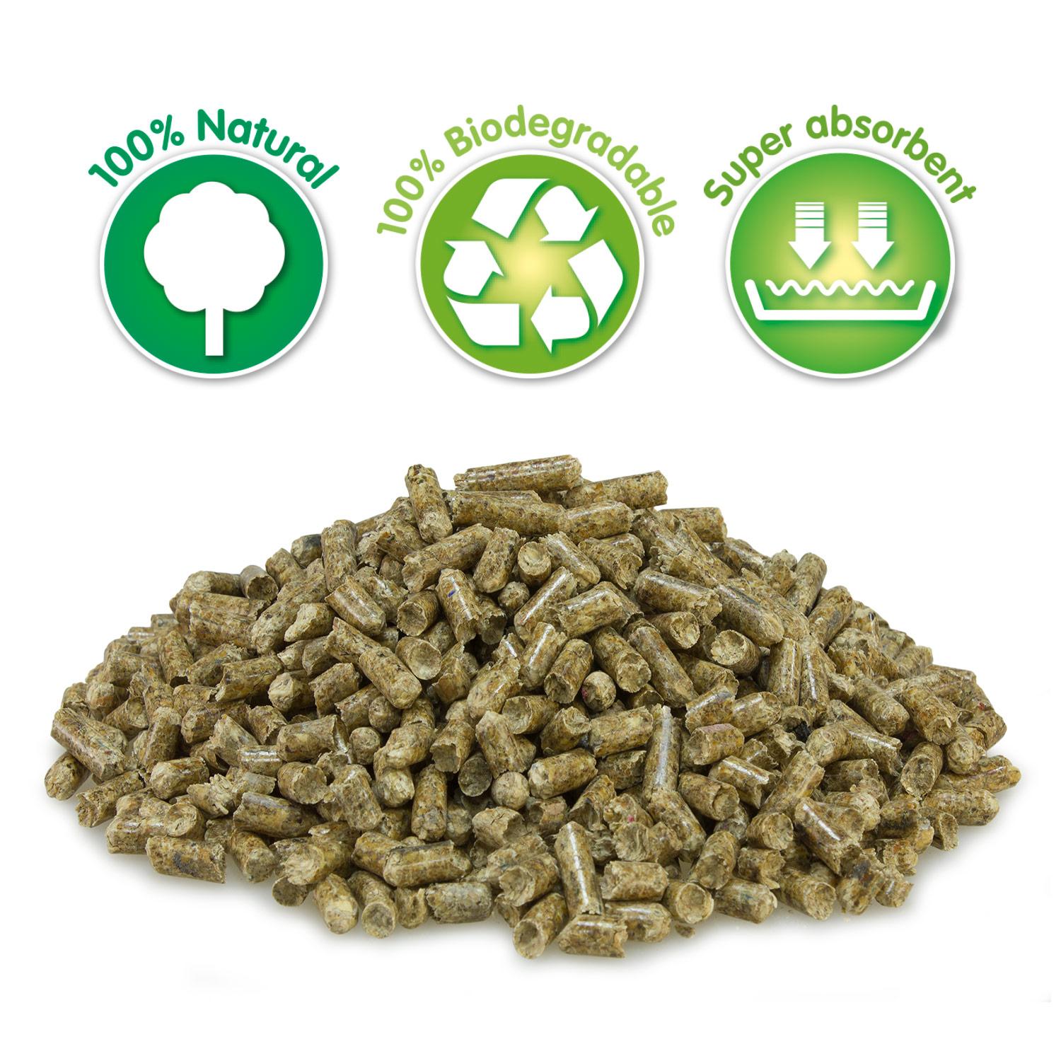 Lecho higiénico para animales de compañía elaborado con pellets de madera natural. Ideal para gatos, roedores, conejos y aves. Ofrece alta absorción, control de olores y es biodegradable.